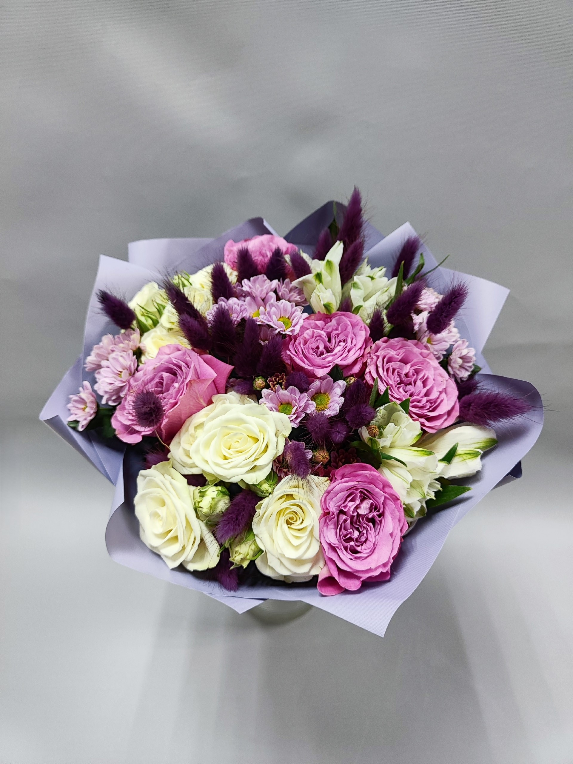 Букет с пионовидными розами, кустовой мини хризантемой Сантини, альстромериями, кустовыми розочками и сухоцветом лагурусом.
