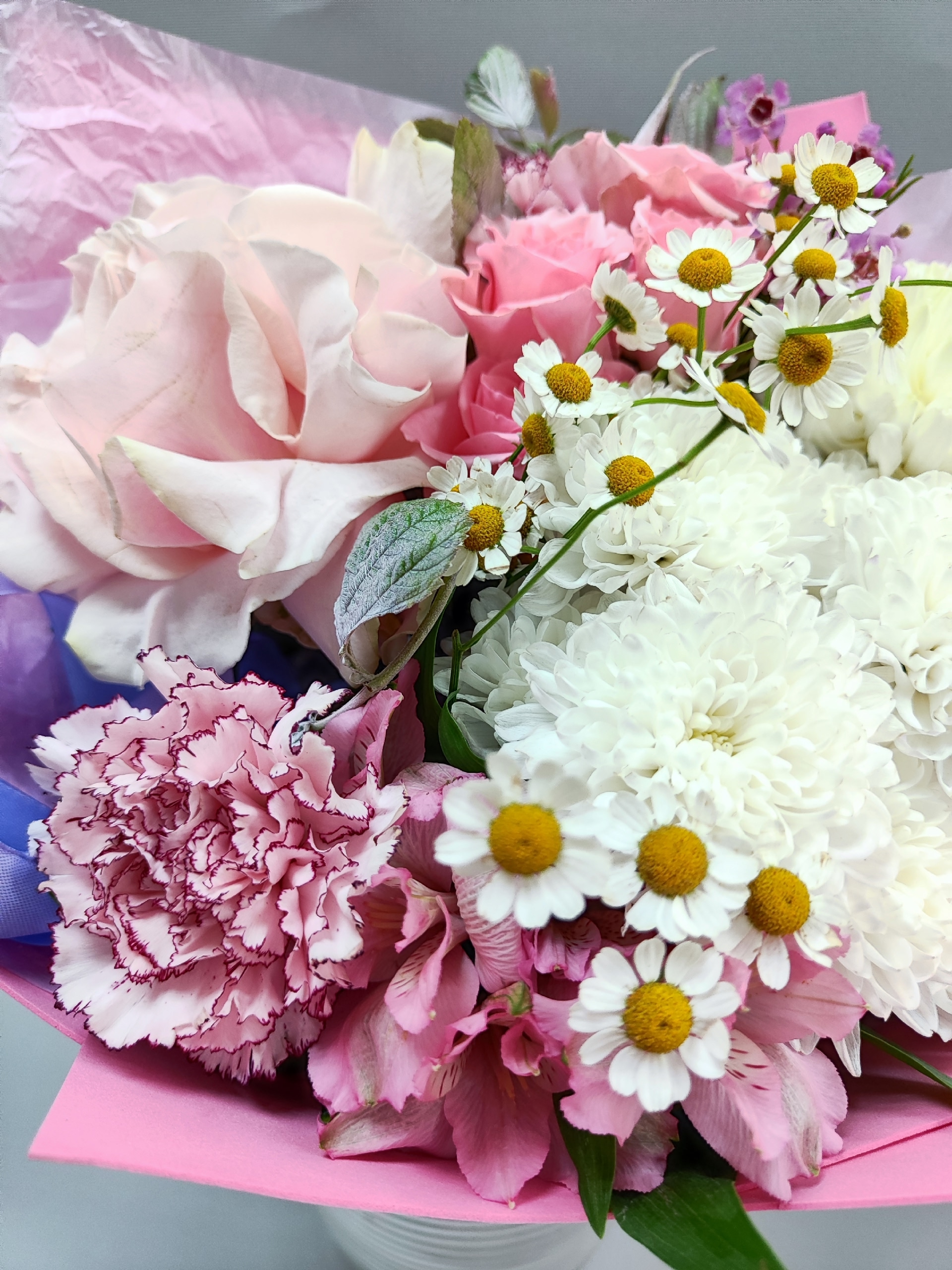 Букет с французской розочкой, диантусами, танацетумом, кустовой розочкой, кустовой и одноголовой хризантемами, альстромерией, зеленью и хамелациумом.