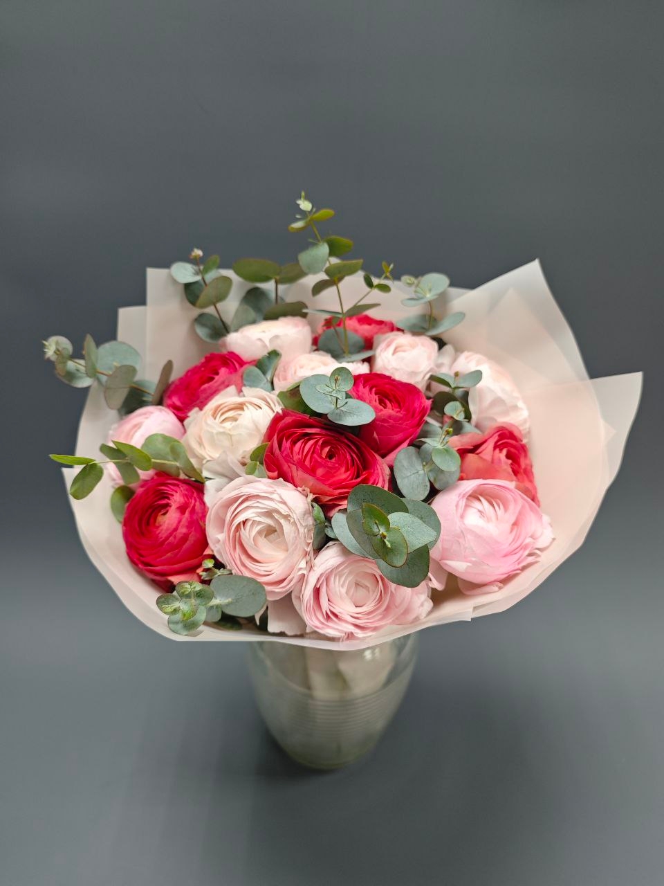 Букет из 15 ранункулюсов с веточками эвкалипта.