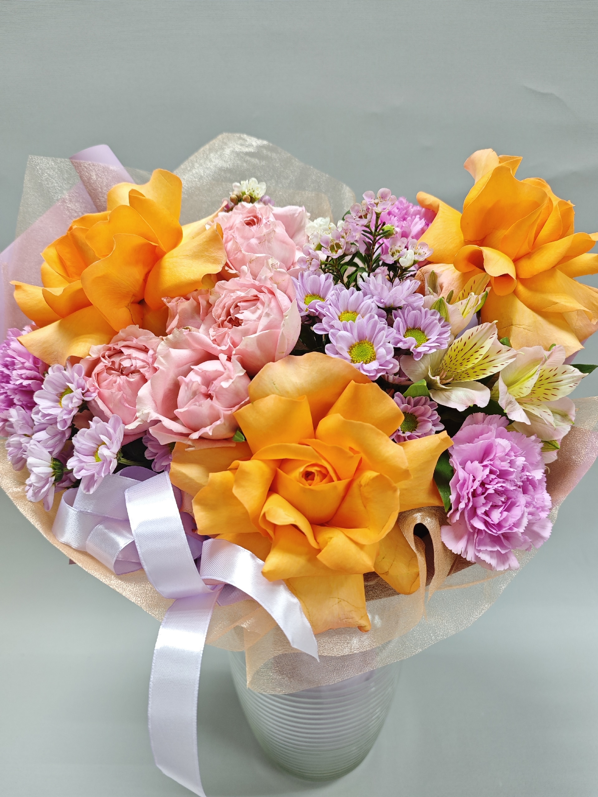 Букет с французскими розами, диантусами, кустовыми мини хризантемами Сантини, альстромерией, кустовой розочкой.