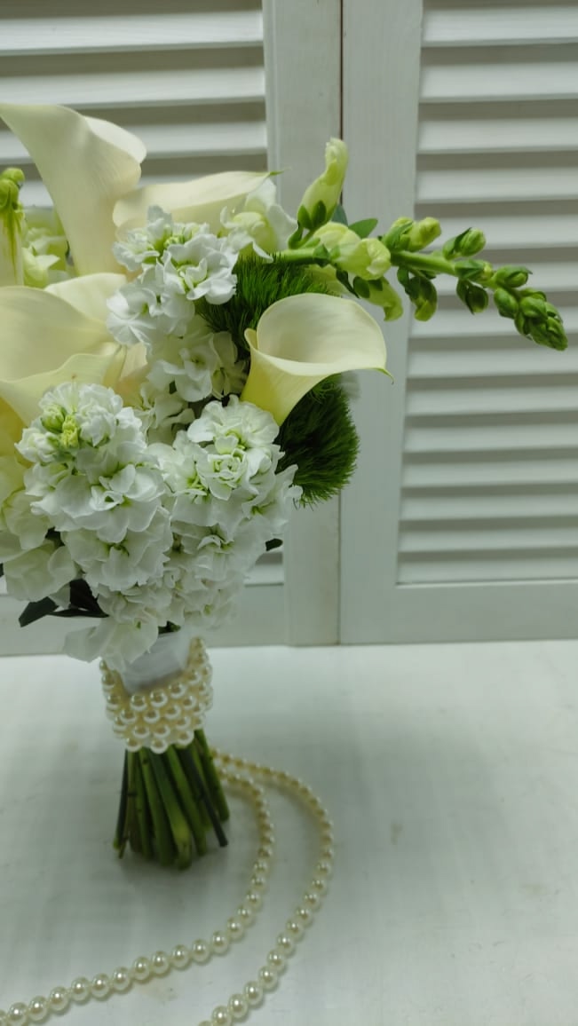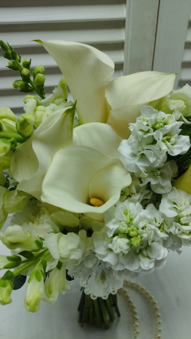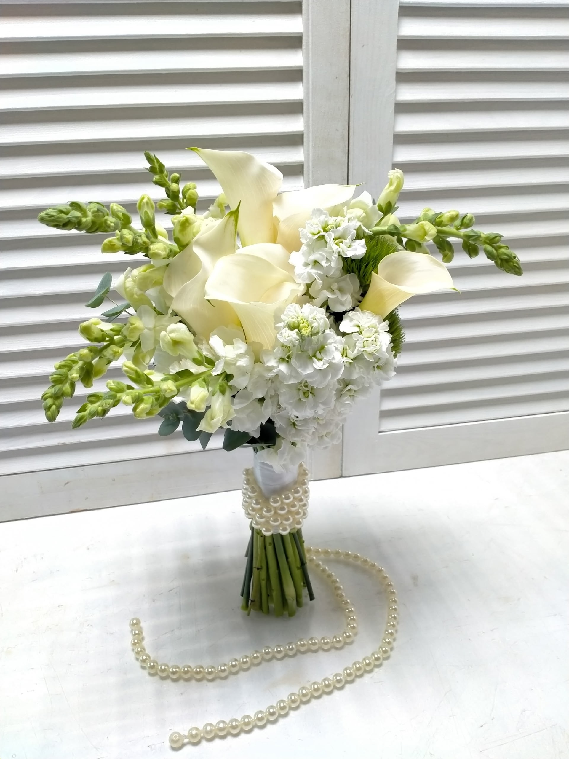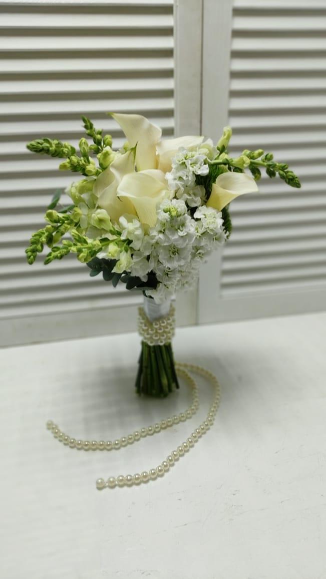 Букет невесты в составе которого роскошные каллы, антирринум, маттиола, чуть эвкалипта и жемчужная нить в качестве декора – ничего лишнего, изысканно и изящно. Декор выполнен из пластиковых бусин высокого качества.