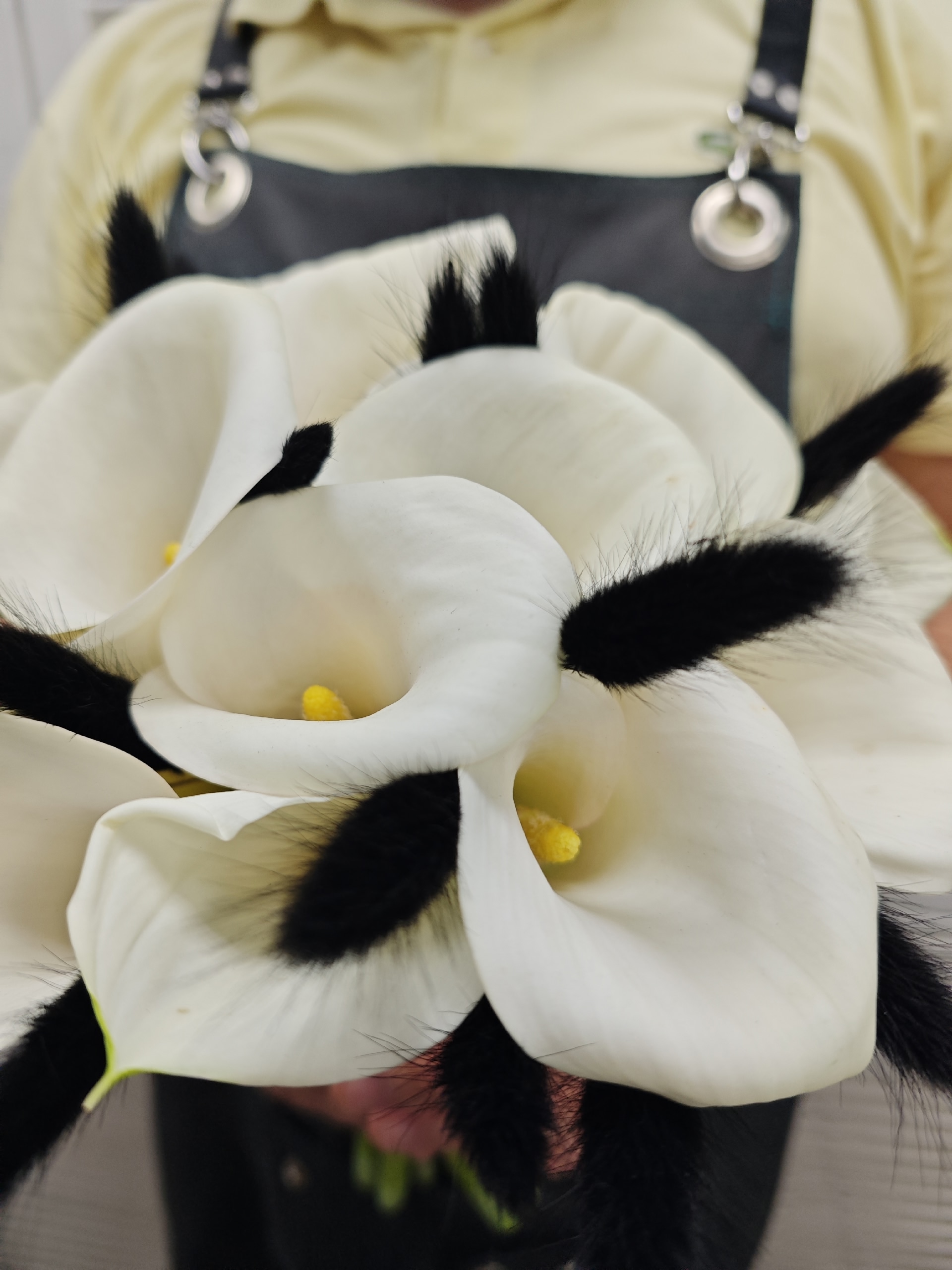 Букет невесты в черно-белой гамме, с каллами и сухоцветами лагуруса.
