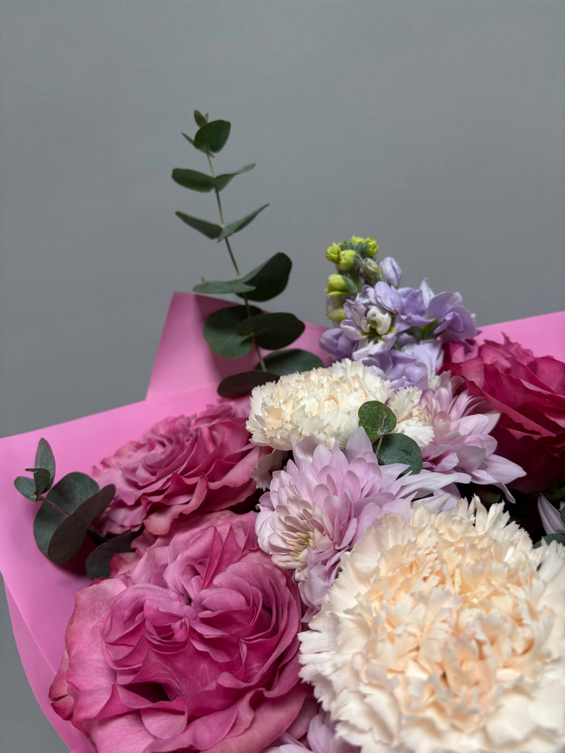 Прелестный букет в ягодных оттенках с пионовидными розами, кустовой хризантемой, маттиолой, диантусами и веточками эвкалипта.