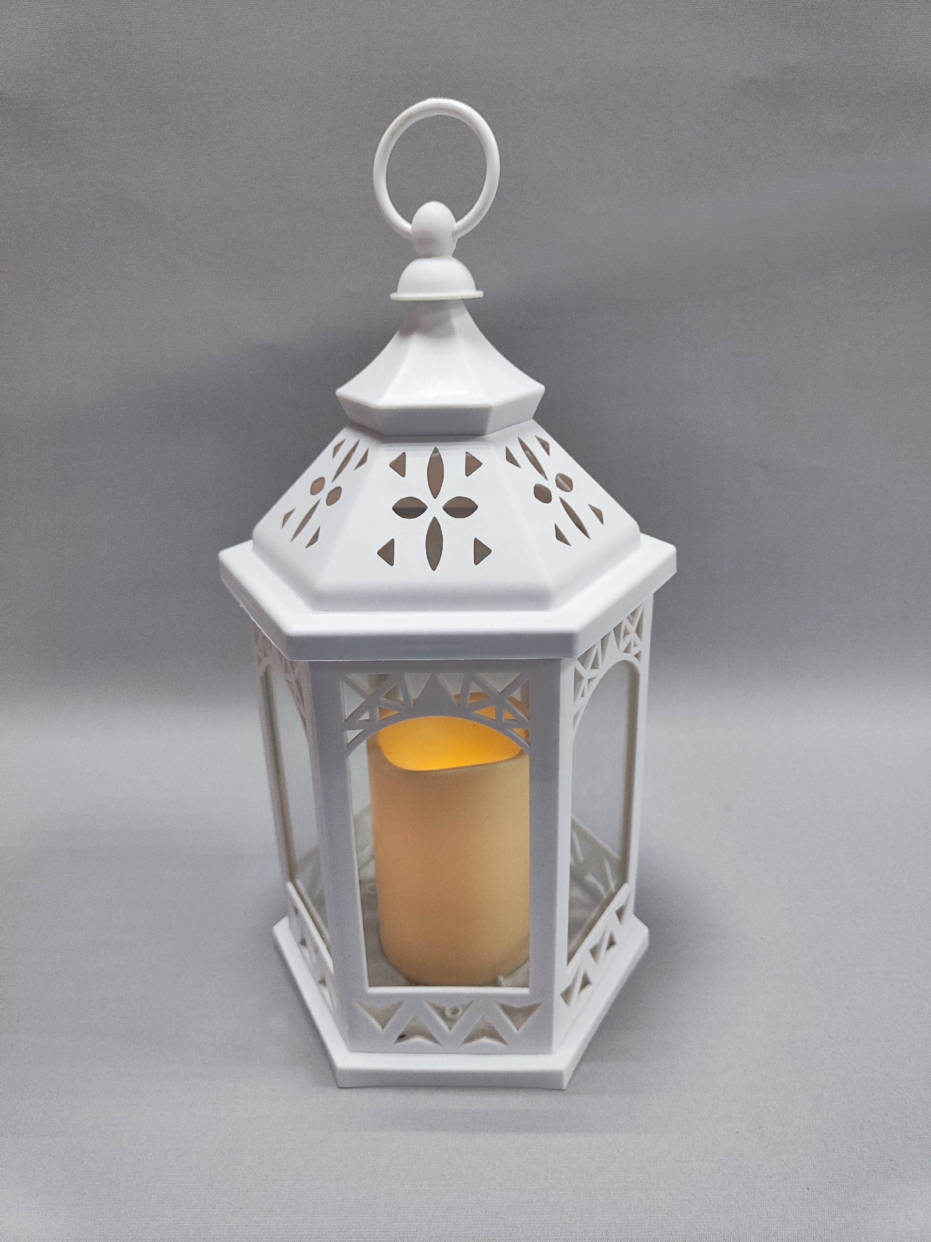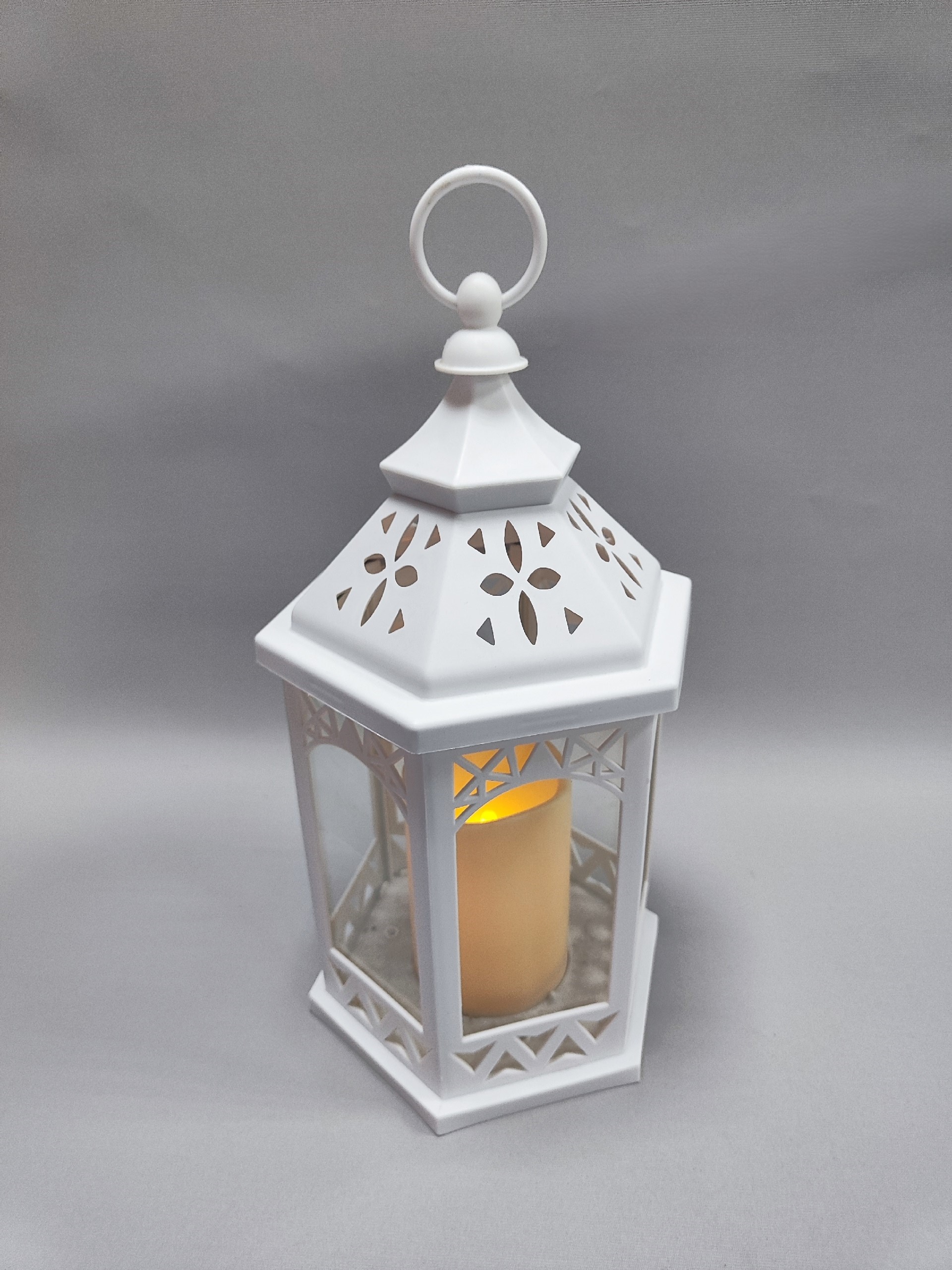 Декоративный белый фонарь со светодиодной свечой с эффектом мерцающего пламени, на батарейках.