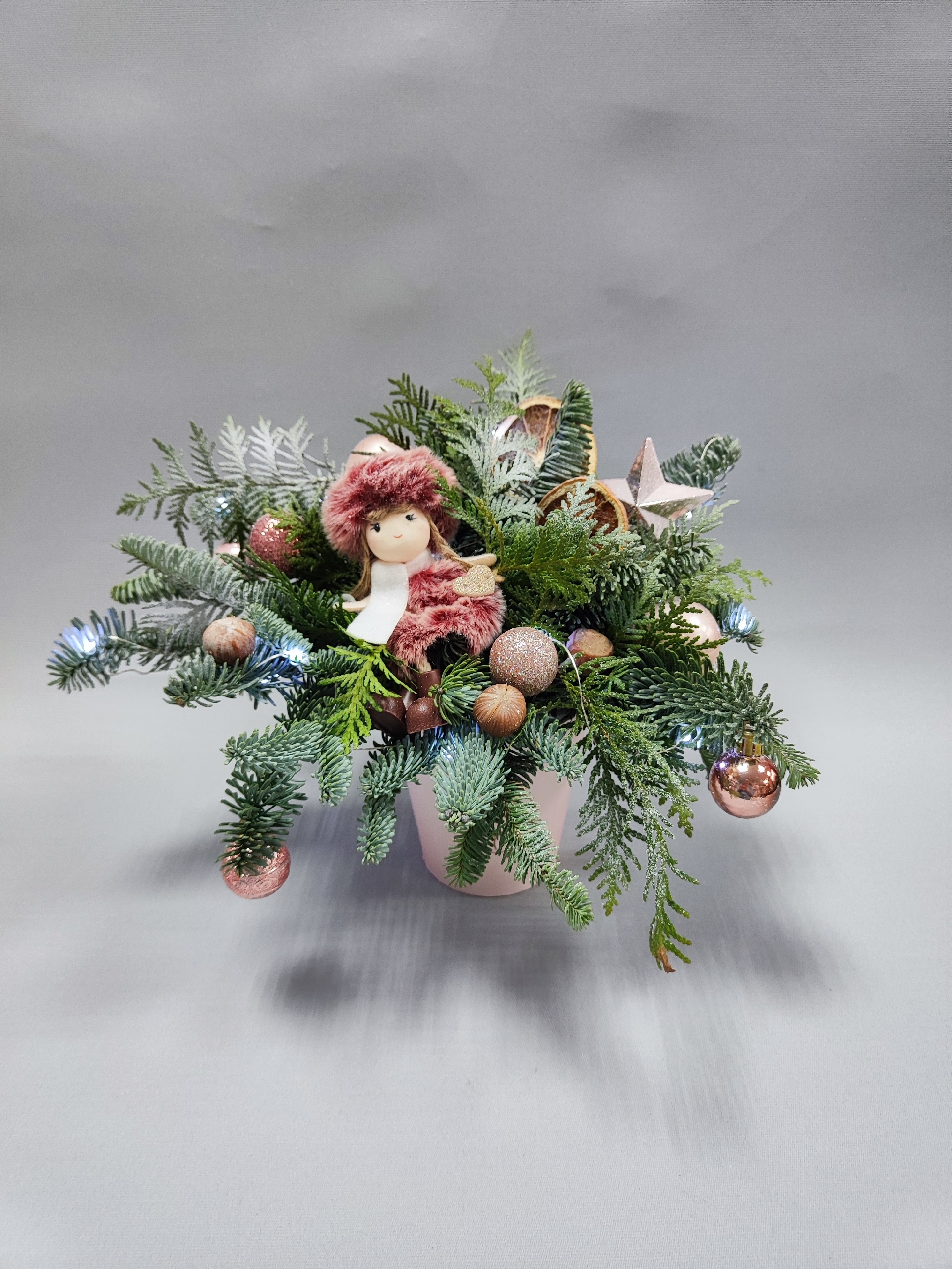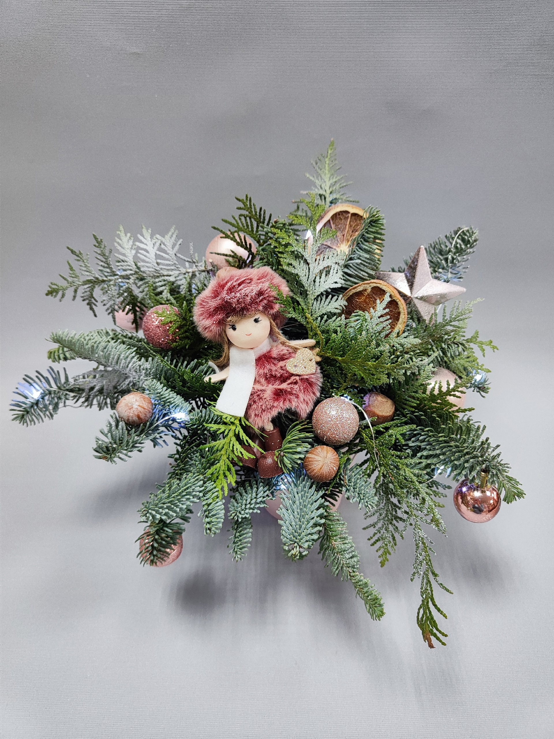 Новогодняя композиция из ели нобилис в небольшом кашпо, украшенная прелестной фигуркой девочки, сушеными слайсами апельсина, шариками, орехами и веточками туи - идеальное решение для создания праздничного настроения в вашем доме и офисе, а так же как чудесный презент.