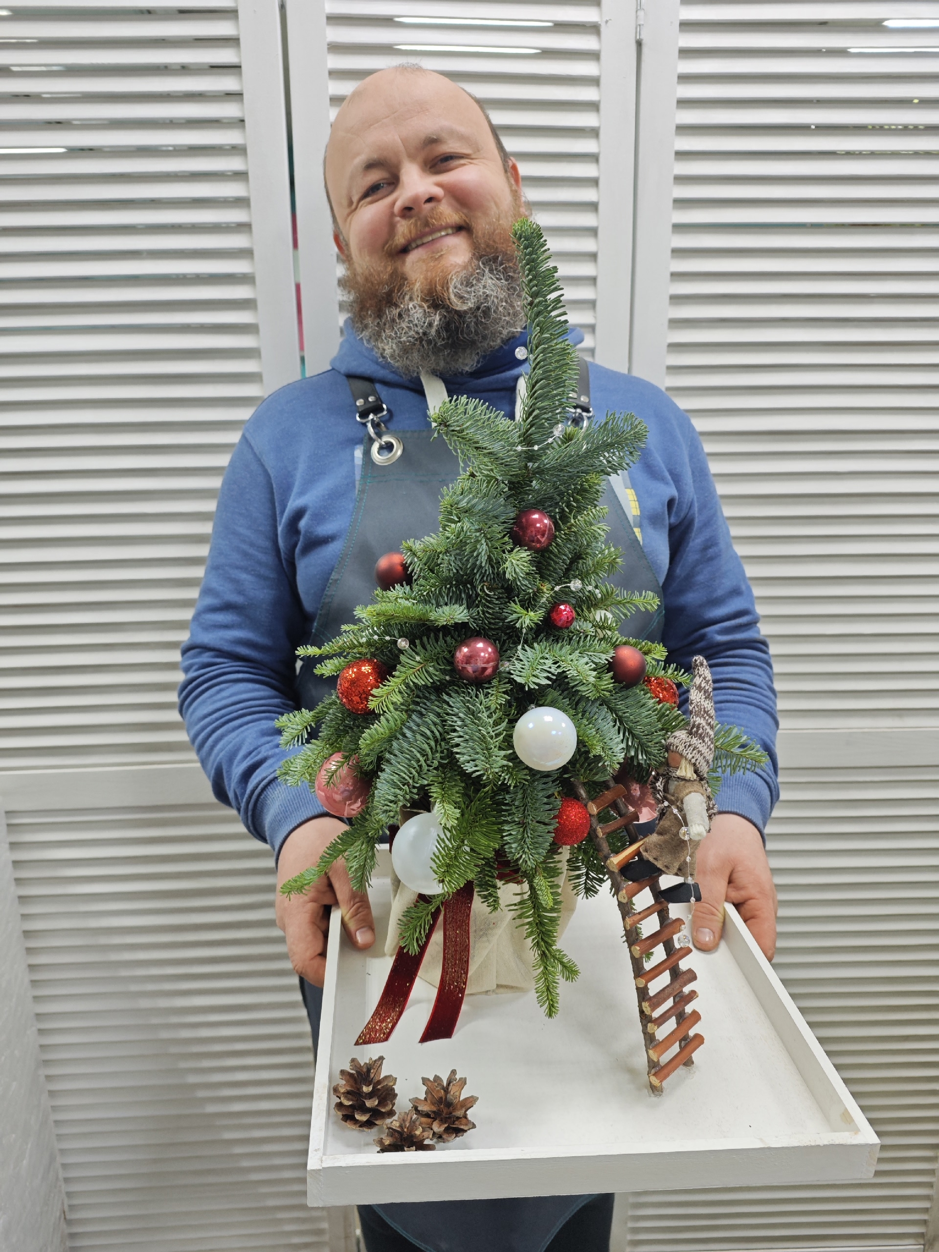 Ёлочка из хвои нобилис, установленная на поднос для мелочей который декорирован сосновыми шишками и украшенная маленьким эльфом-помощником на лестнице - это не просто новогоднее украшение, это настоящий символ праздника и уюта в вашем доме.