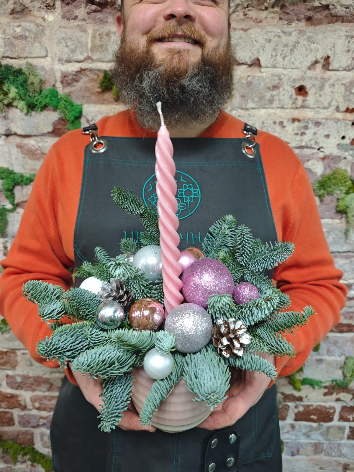 Очаровательная новогодняя композиция из ели нобилис в прелестном керамическом кашпо, дополненная изящной витой свечой, шарами и шишками.
