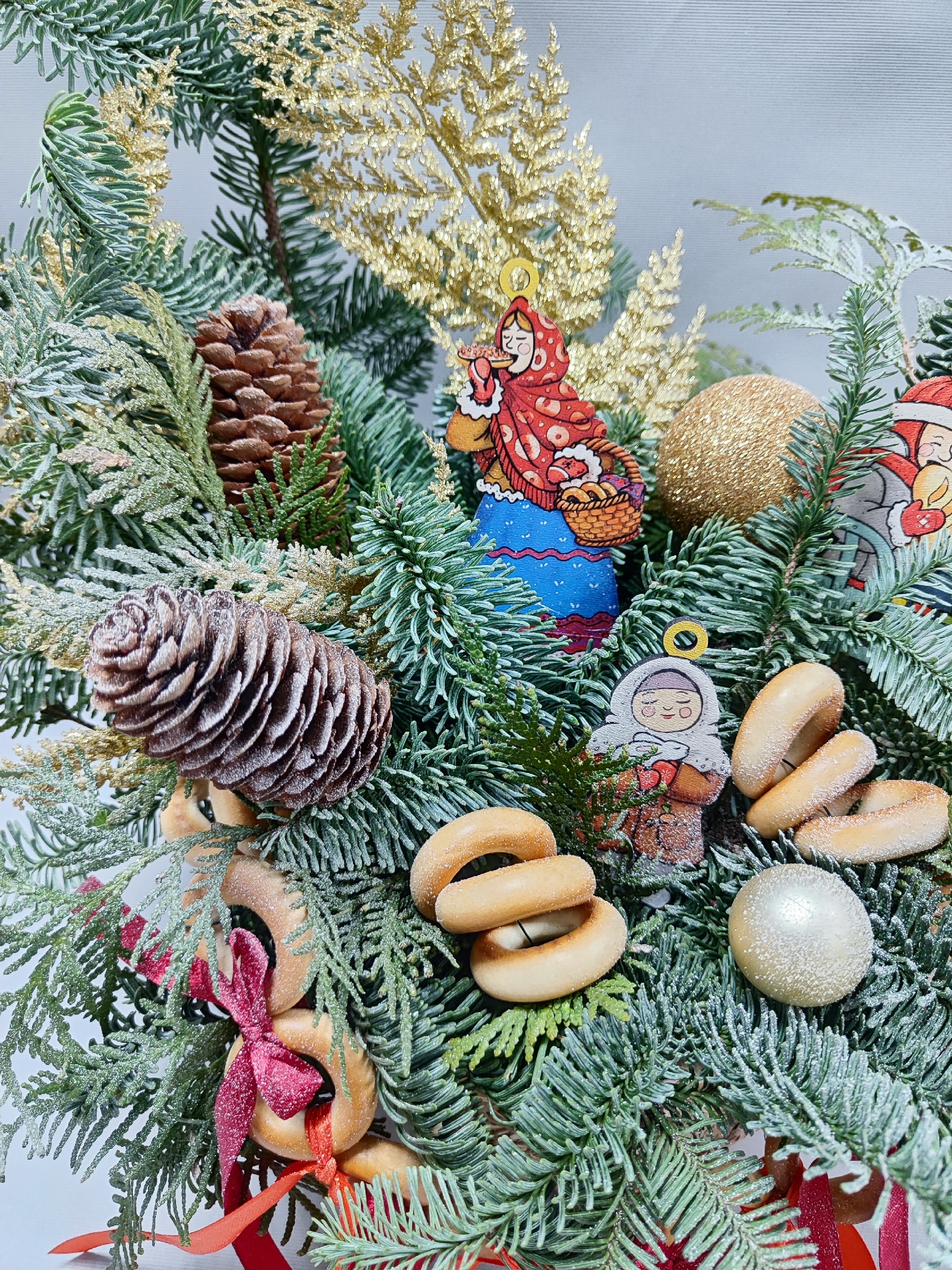 Новогодняя композиция из ели нобилис в уютном плетеном кашпо с разными фигурками, веточками туи, декоративными ветками с золотым глиттером, шариками, шишками и гирляндой из сушек - чудесное решение для создания праздничного настроения в вашем доме и офисе, а так же как чудесный презент.