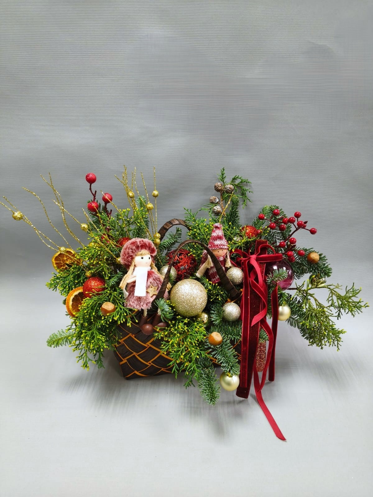 Новогодняя композиция из ели нобилис в оригинальной плетеной сумке, декорированная разными фигурками, веточками кипариса, декоративными ветками с золотым глиттером, шариками, слайсами сушеного апельсина, орехами и бархатными бантами - чудесное решение для создания праздничного настроения в вашем доме и офисе, а так же как чудесный презент.