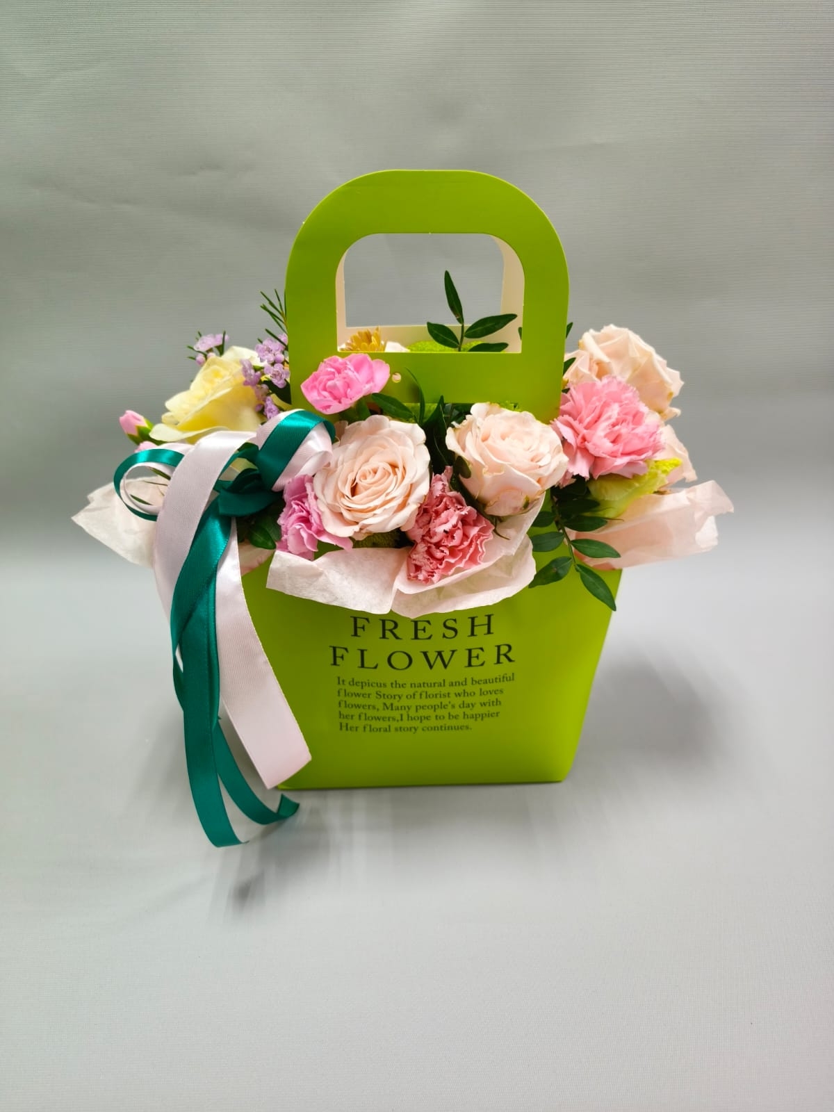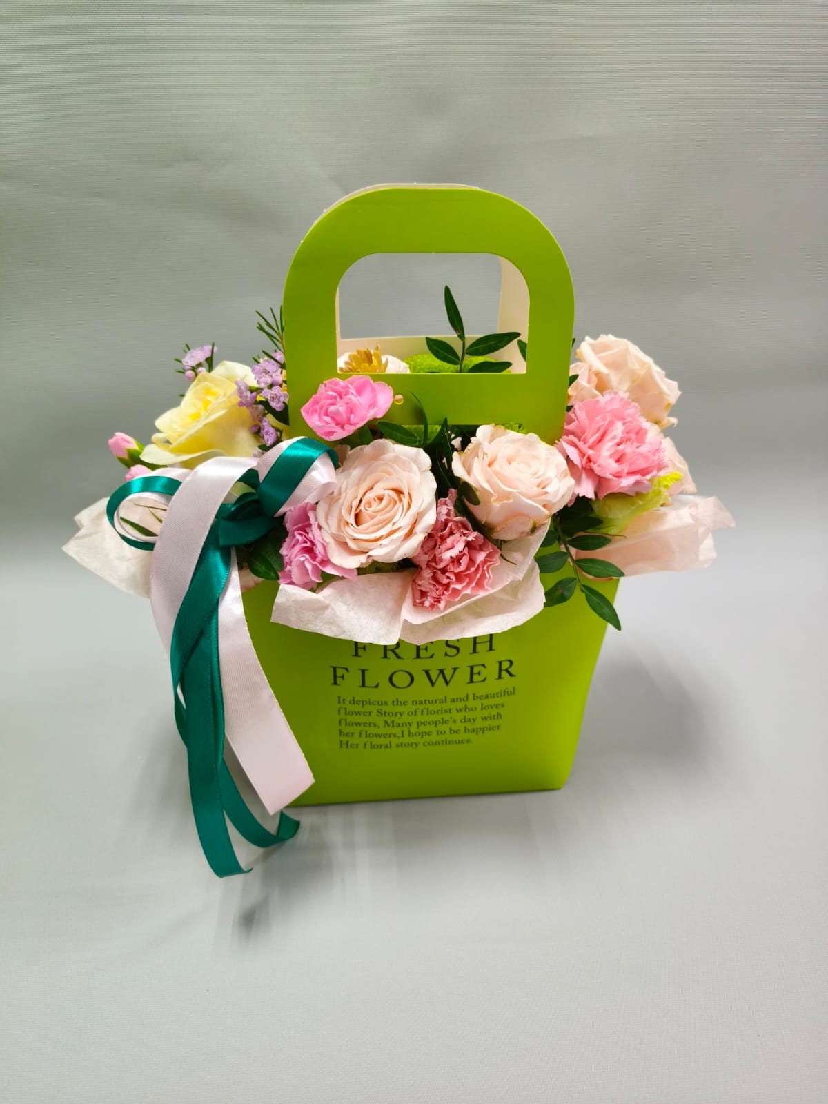 Композиция в стильной сумочке с пионовидной розой, диантусами, кустовой розочкой, хамелациумом и кустовой хризантемой.