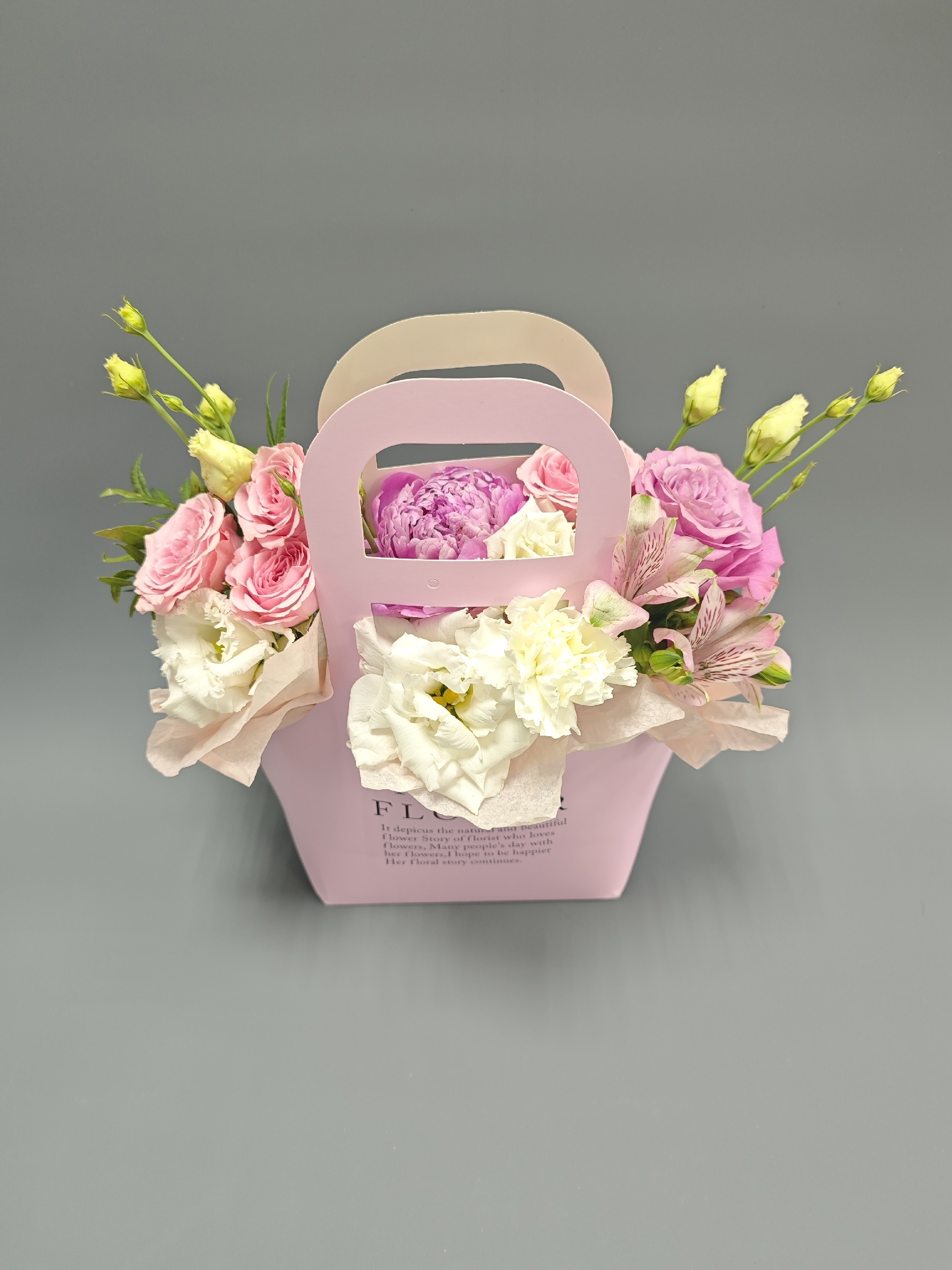 Композиция в стильной сумочке с пионовидной розой, лизиантусом, кустовой розочкой, альстромерией и диантусом.
