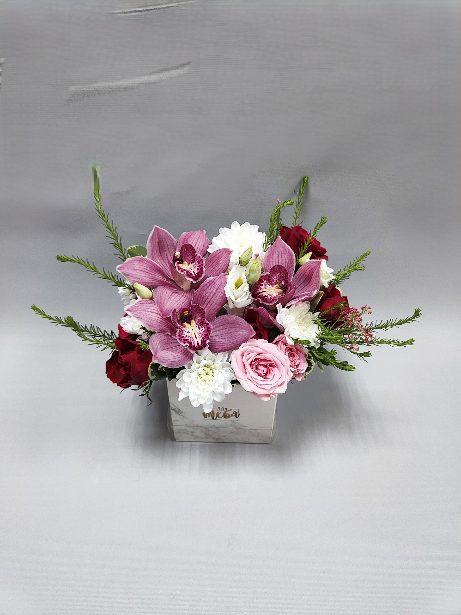 Композиция в прелестной коробочке с кустовыми розами и хризантемами, орхидеями, лизиантусом и веточками зелени.