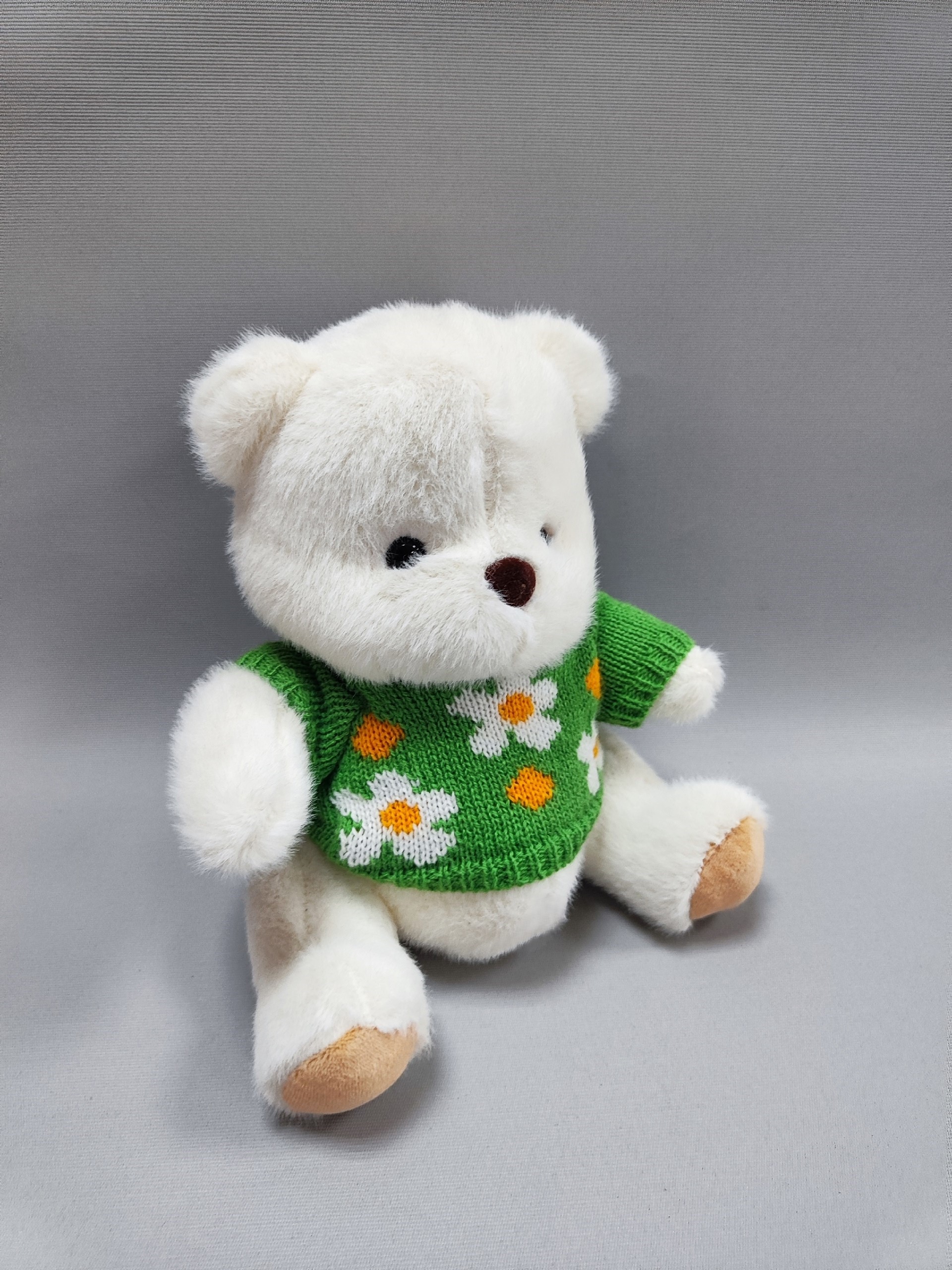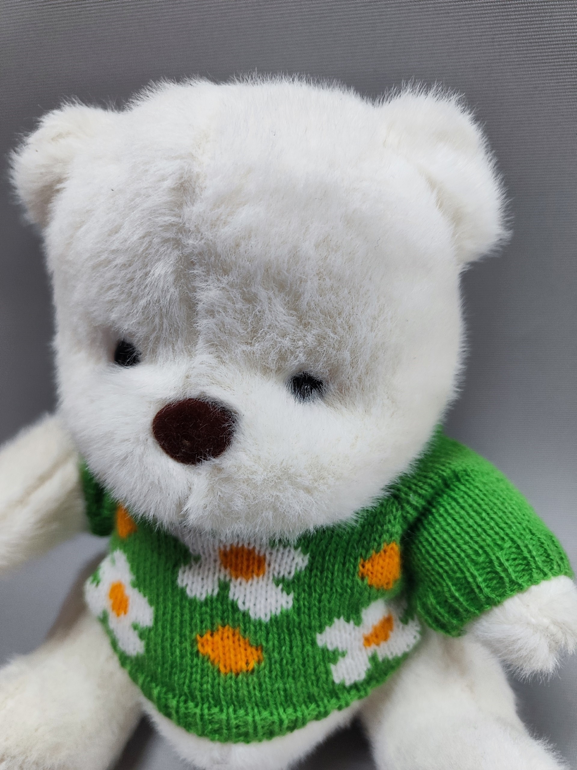 Мягчайший белый медвежонок в свитере обязательно порадует получателя