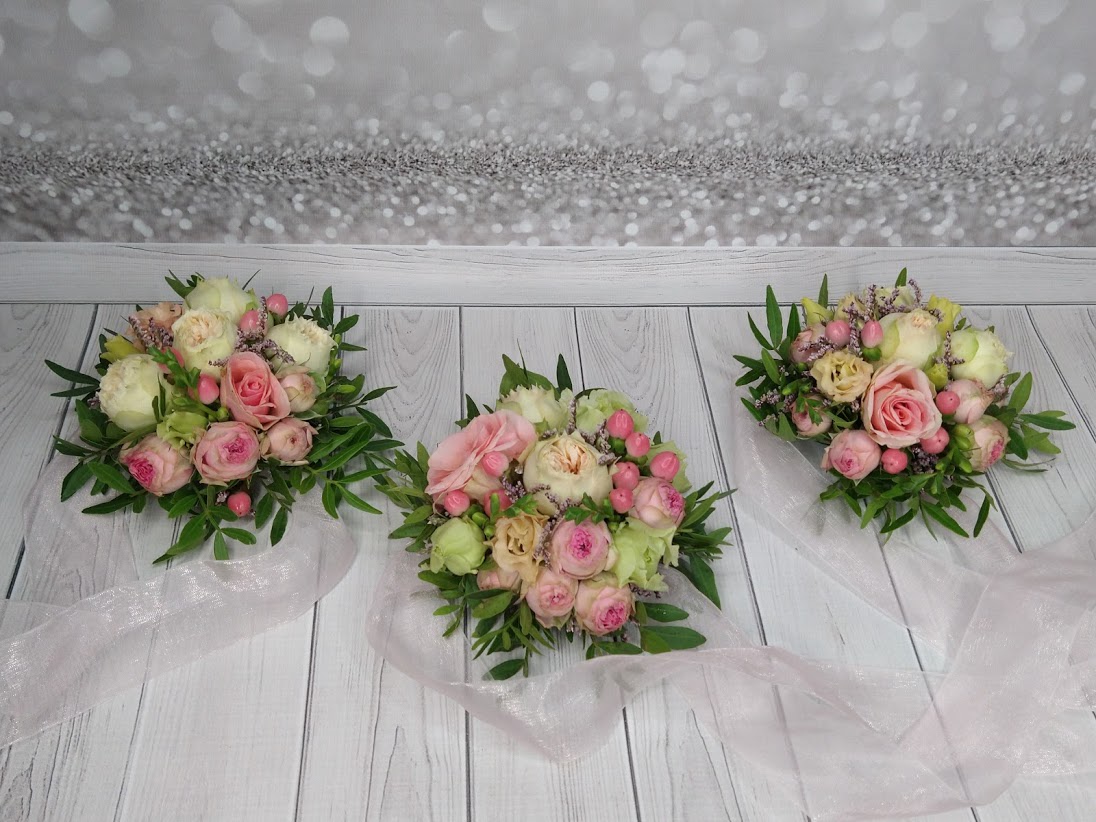 К любому букету невесты можем дополнительно собрать из живых цветов бутоньерку для жениха и гостей и браслеты или веночки для подружек невесты.