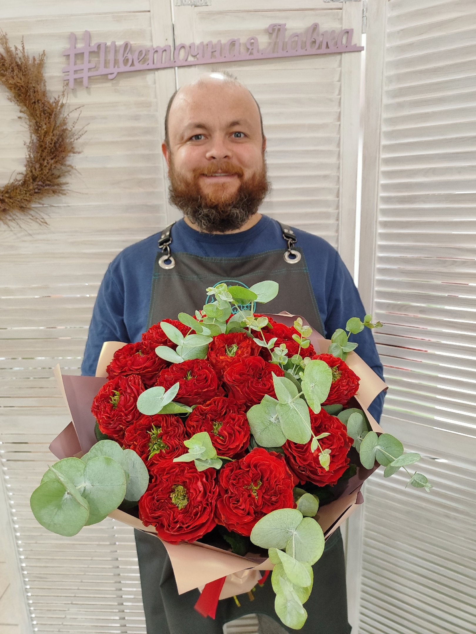Букет из 15 пионовидных роз сорта Red Eye c веточками эвкалипта.