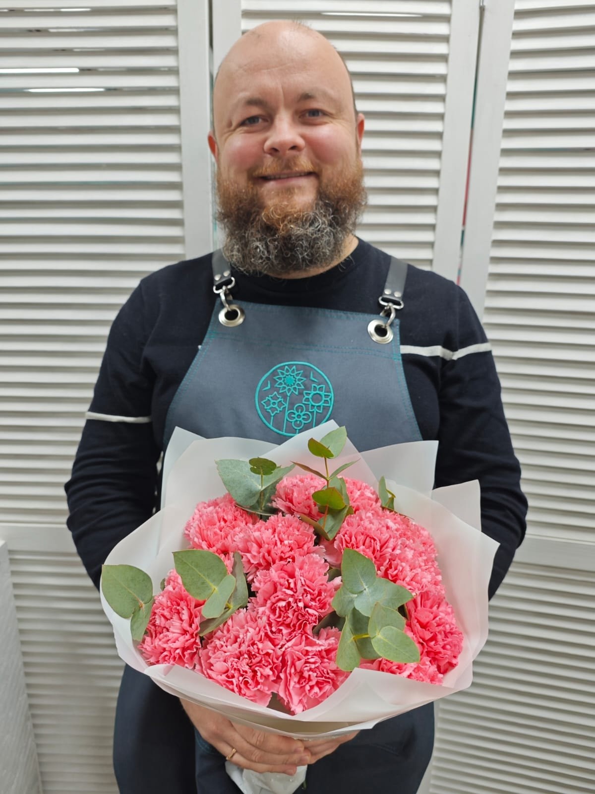 Букет из 15 нежных диантусов с веточками эвкалипта.