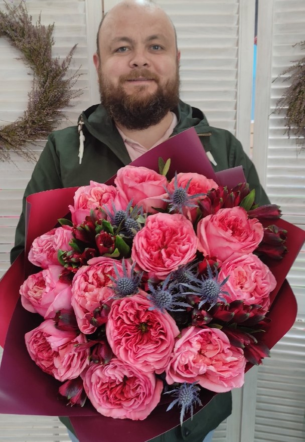 Яркий букет из пионовидных роз сорта Pink Expression, эрингиума и альстромерий.