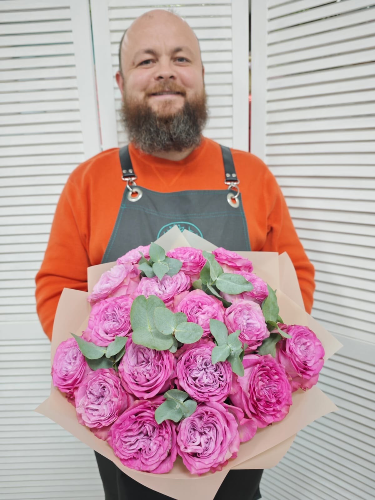 Букет из 17 пионовидных роз сорта Queens Crown и веточек эвкалипта