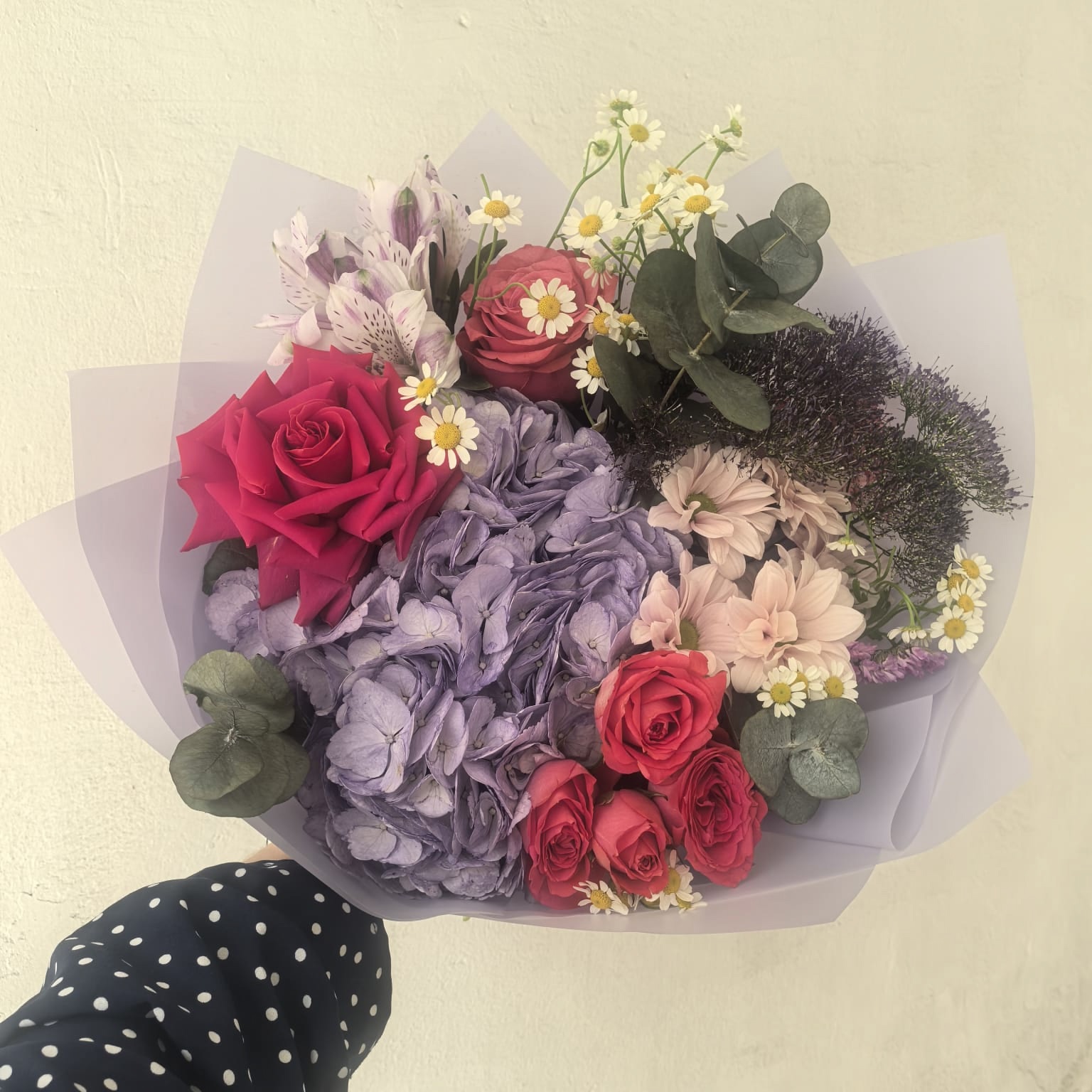Яркий и необычный букет с гортензией, "французской" розой, кустовыми розочками, кустовой ромашкой, веточками эвкалипта, альстромерией, кустовой хризантемой и трахелиумом.