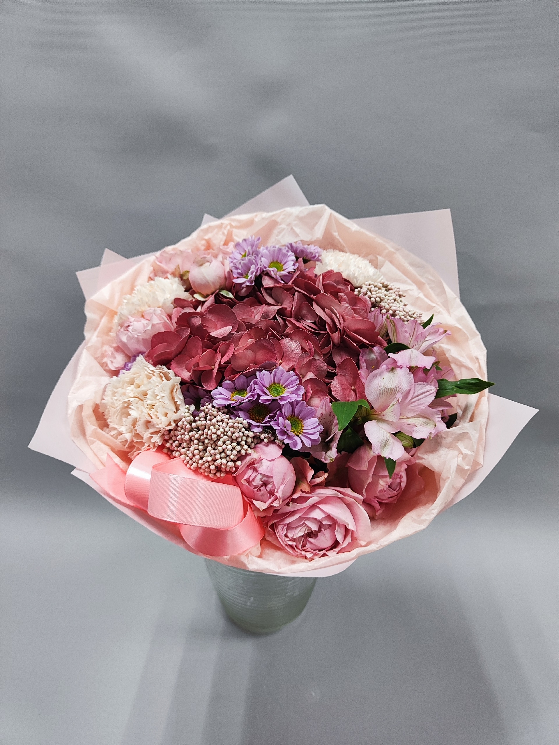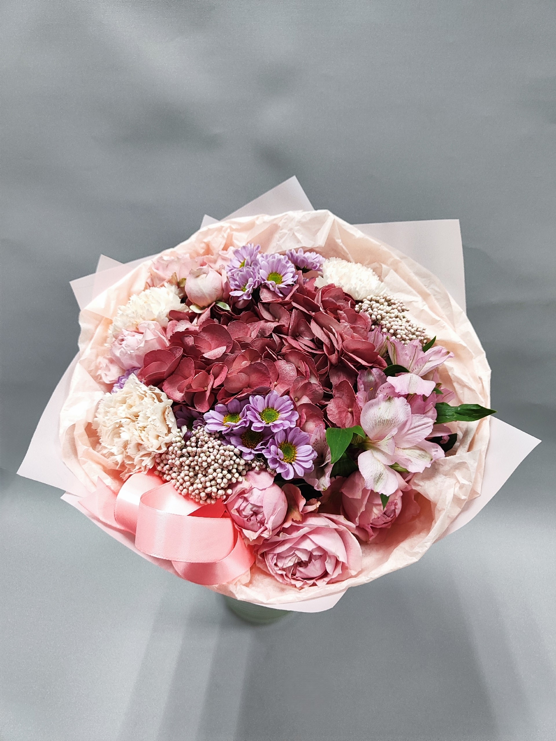 Милый букет в бруснично-розовых тонах с гортензией, кустовыми розочками, озотамнусом, диантусом, альстромерией и мини хризантемами Сантини.