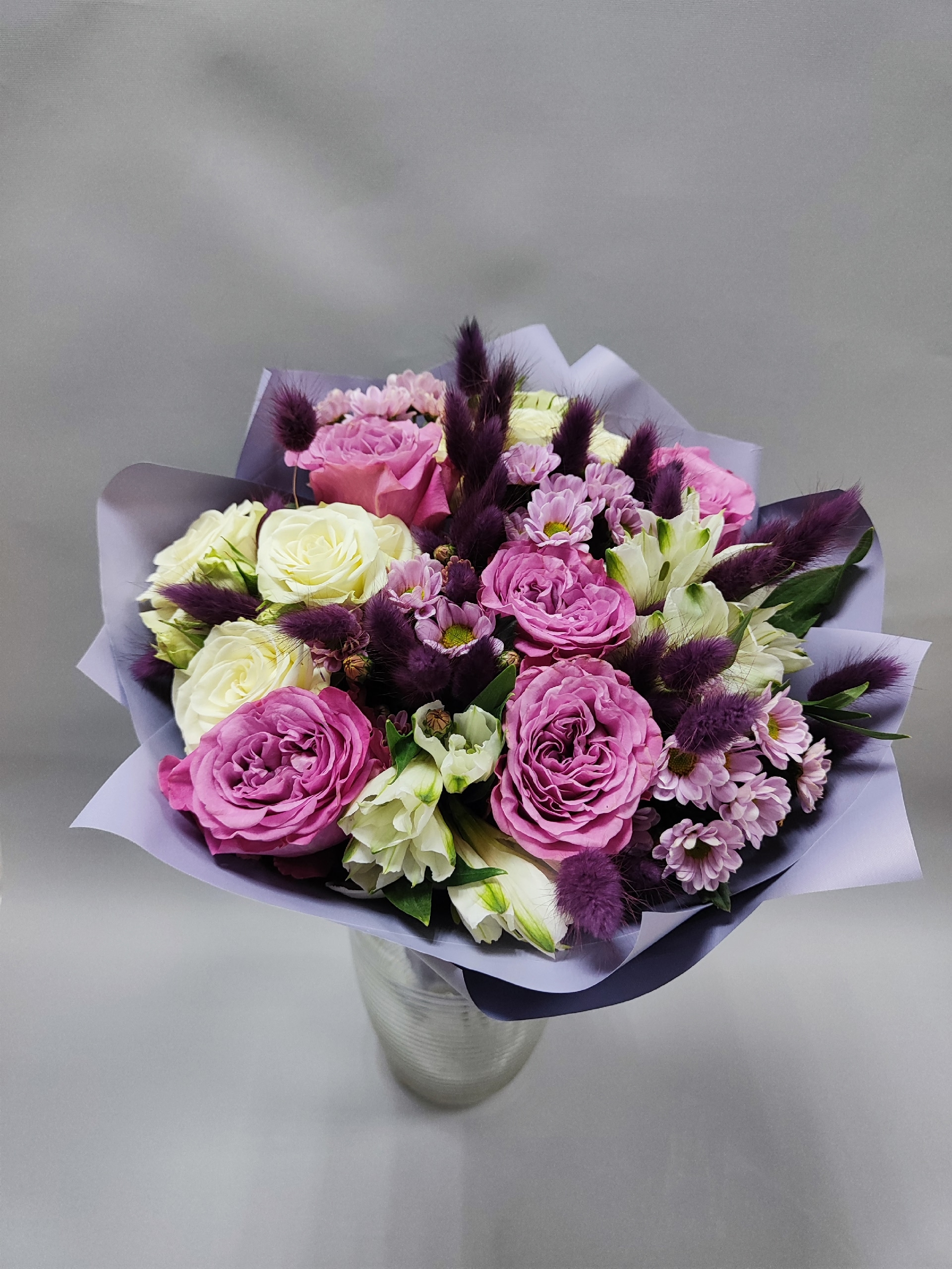 Букет с пионовидными розами, кустовой мини хризантемой Сантини, альстромериями, кустовыми розочками и сухоцветом лагурусом.