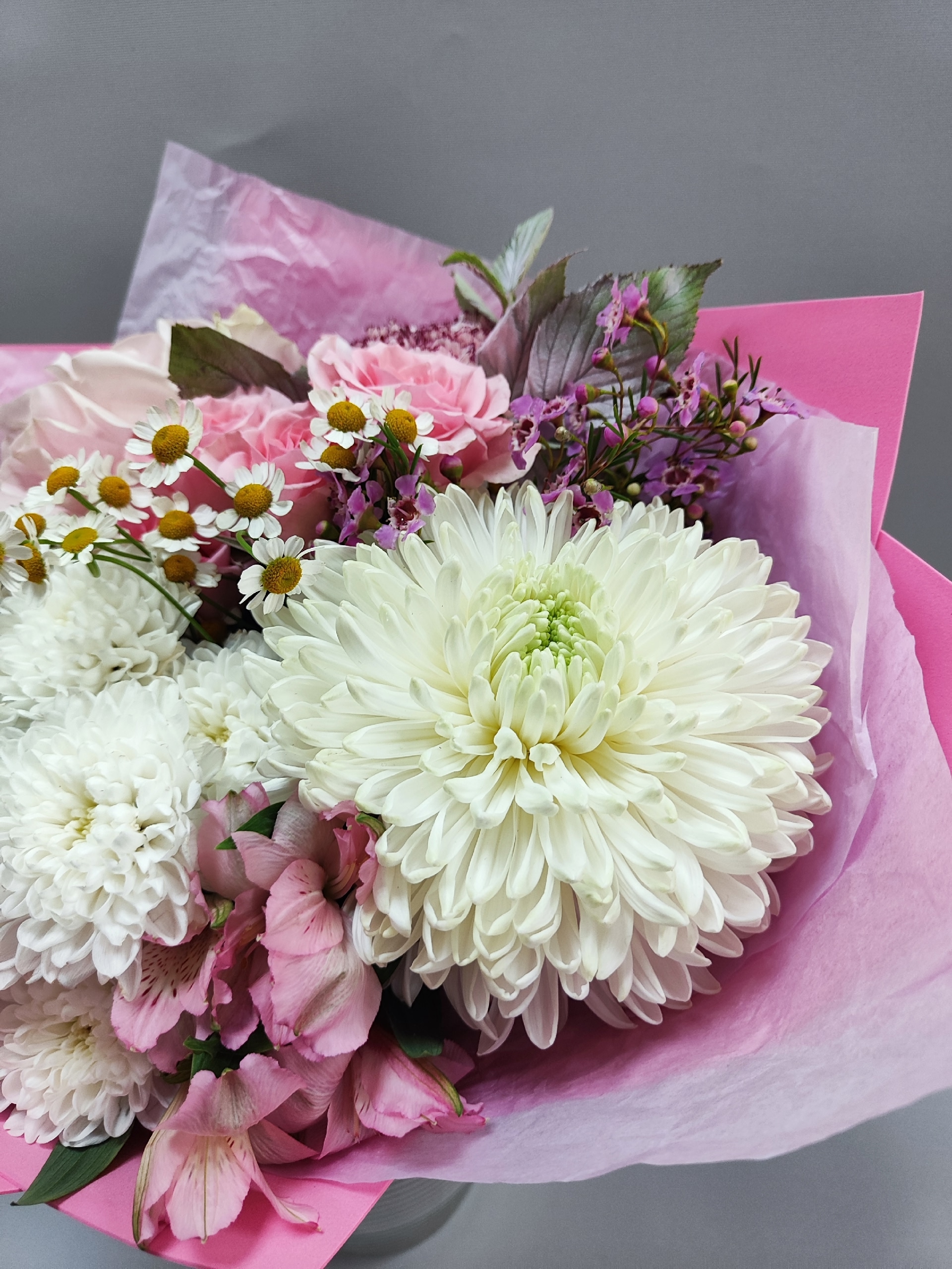 Букет с французской розочкой, диантусами, танацетумом, кустовой розочкой, кустовой и одноголовой хризантемами, альстромерией, зеленью и хамелациумом.
