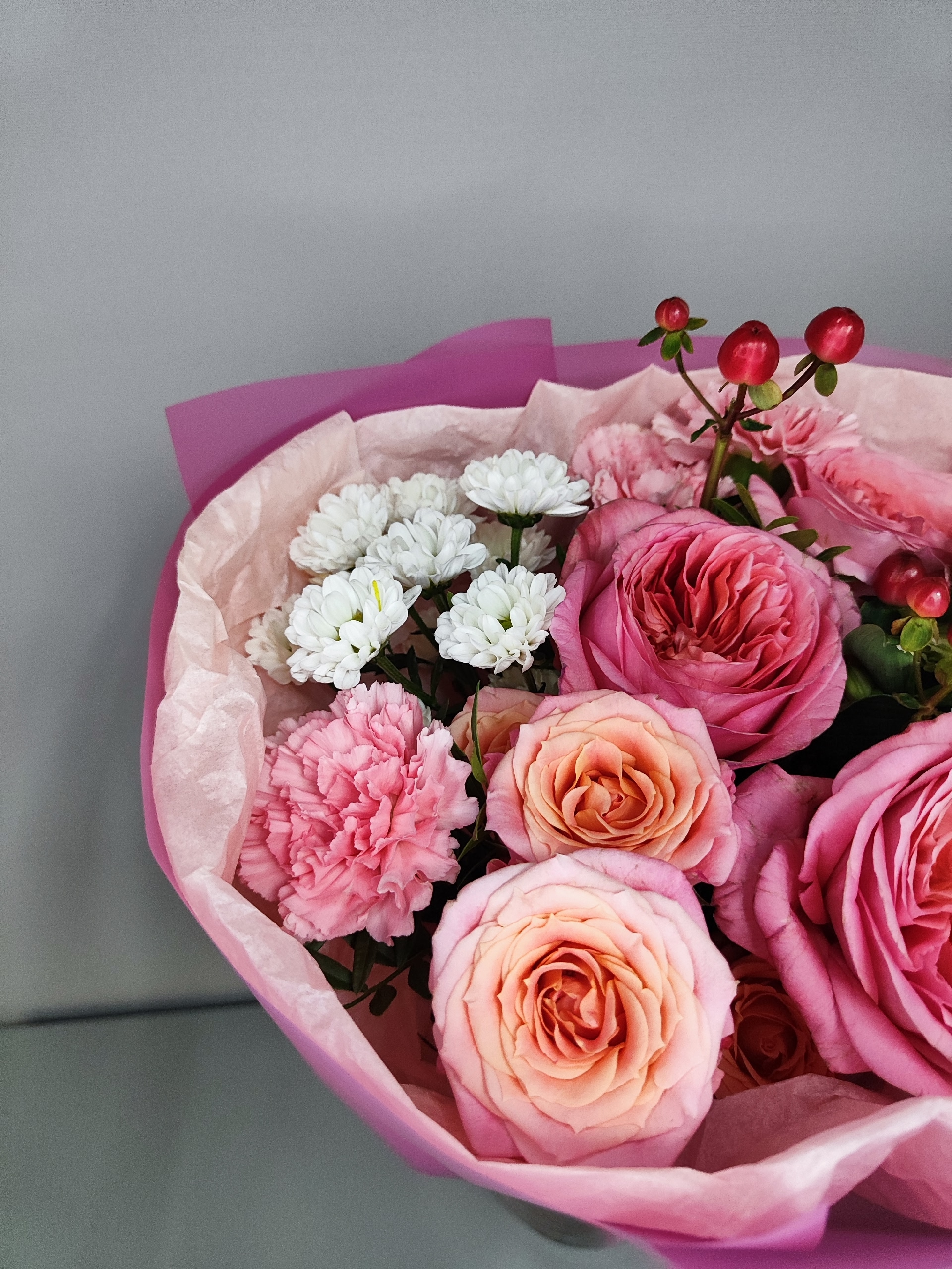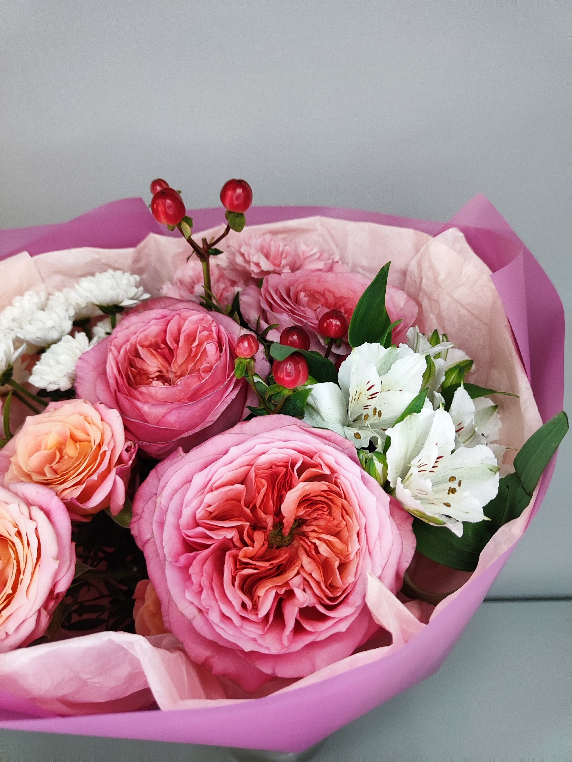 Букет с пионовидными розами, ягодами гиперикума, альстромерией, диантусом, кустовой розочкой и мини хризантемой Сантини.
