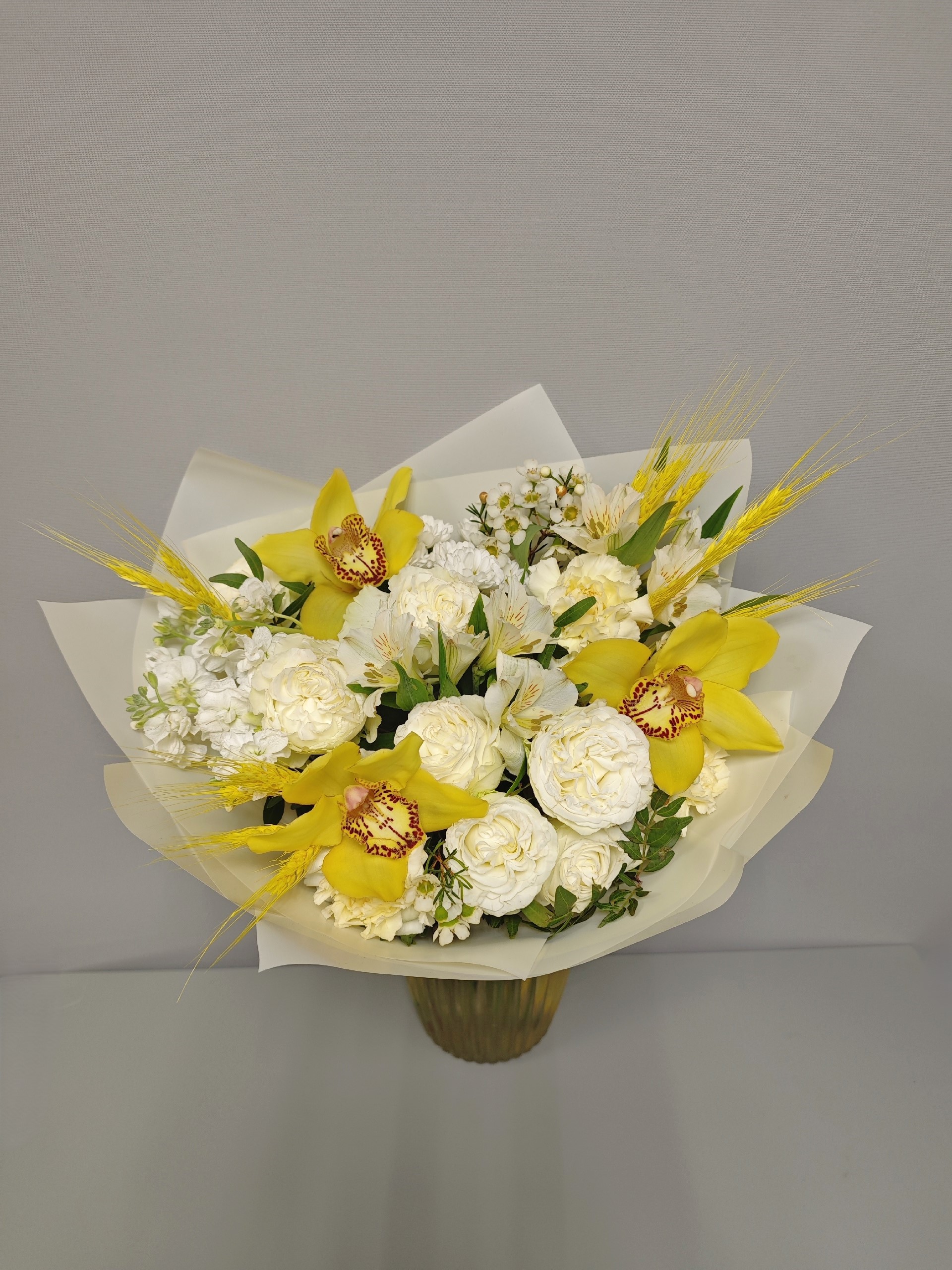 Необычный букет с орхидеями, сухоцветами, кустовыми розочками, хамелациумом, альстромерией и маттиолой.