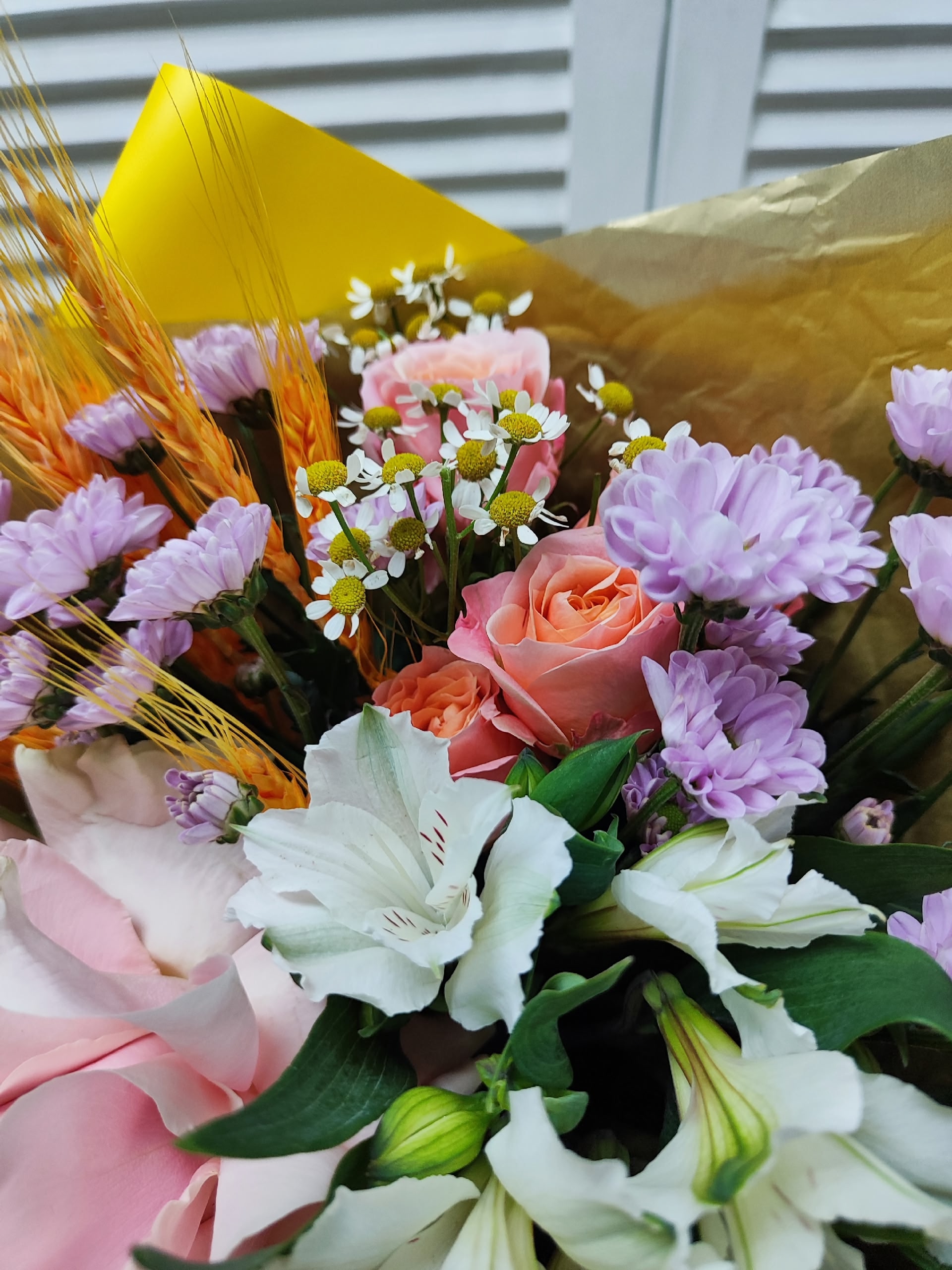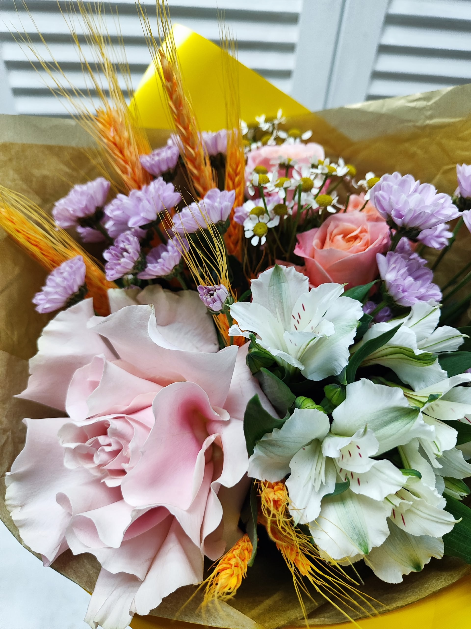 Букет с французской и кустовой розочками, альстромерией, мини хризантемой Сантини, танацетумом, колосками.