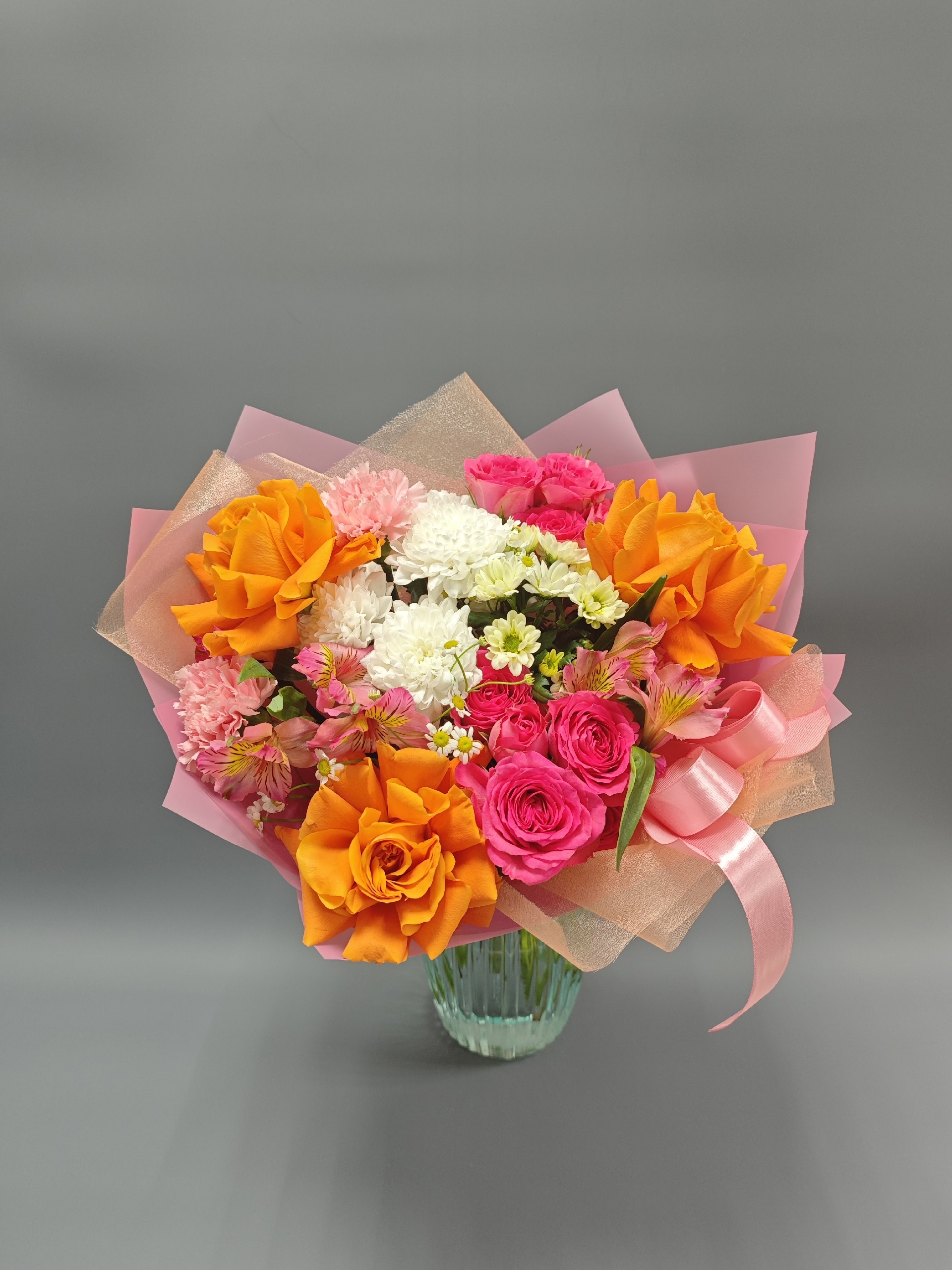 Яркий и необычный букет с французскими розами, альстромерией, кустовыми розочками, мини кустовой хризантемой Сантини и диантусами.