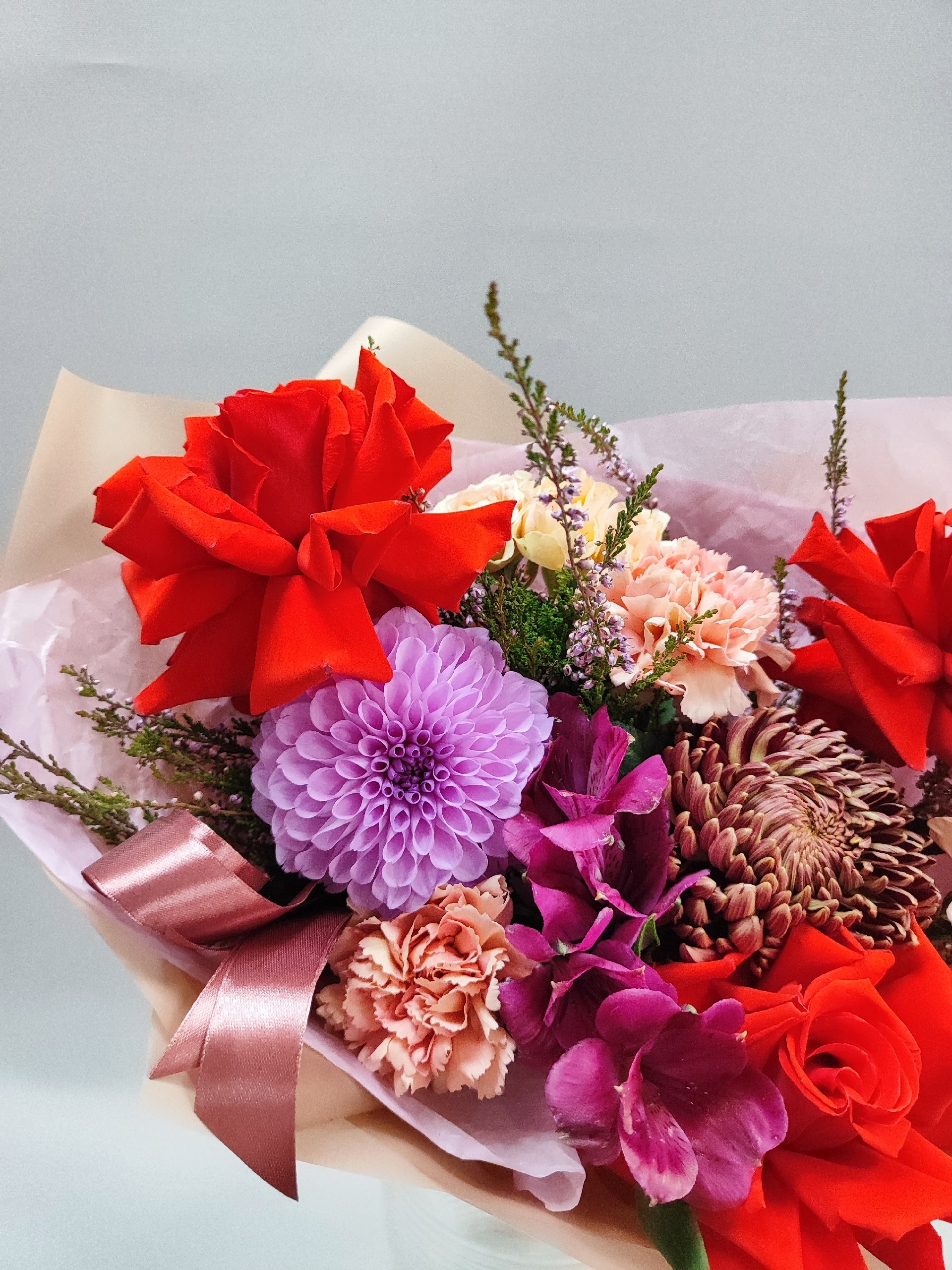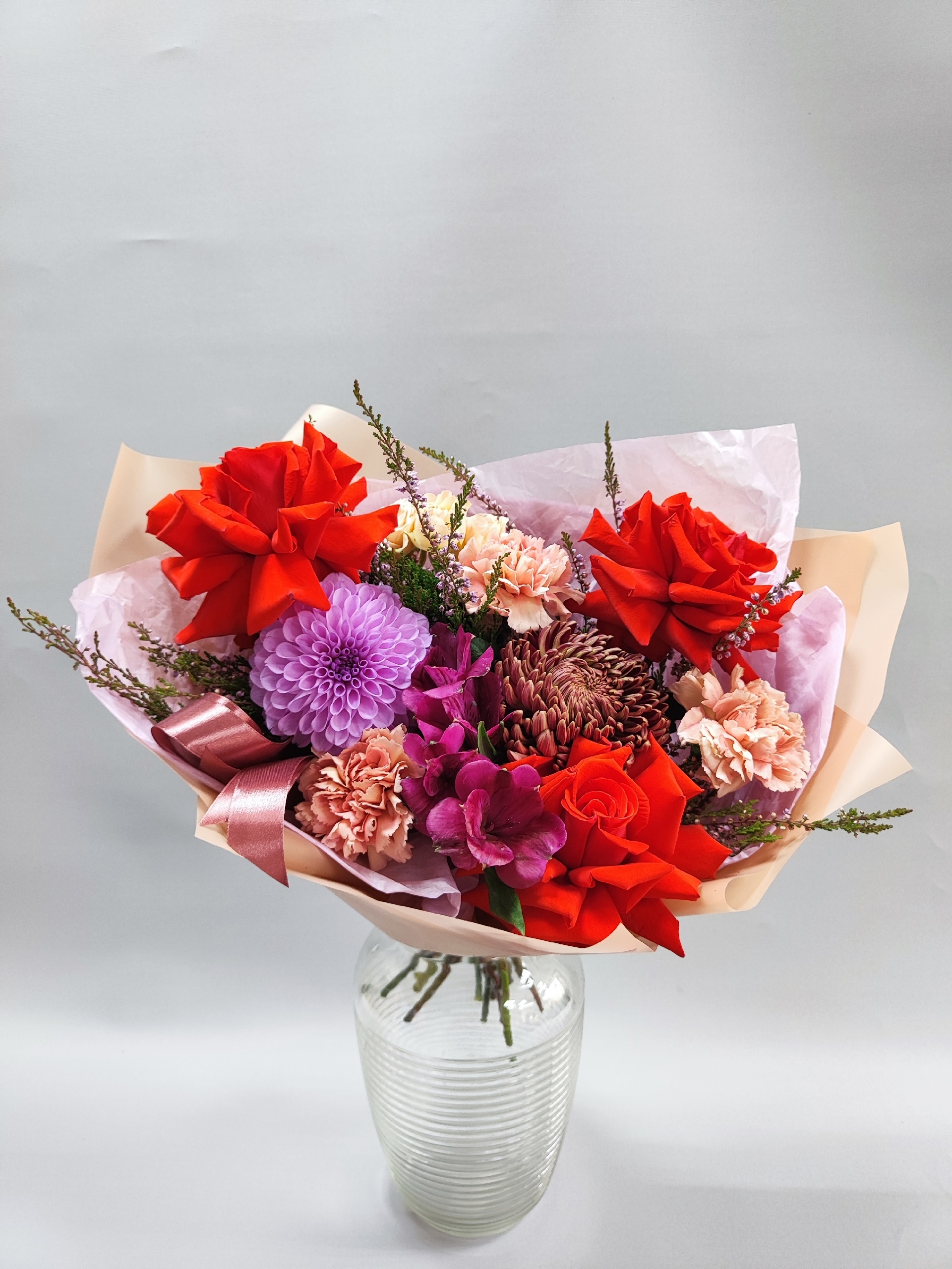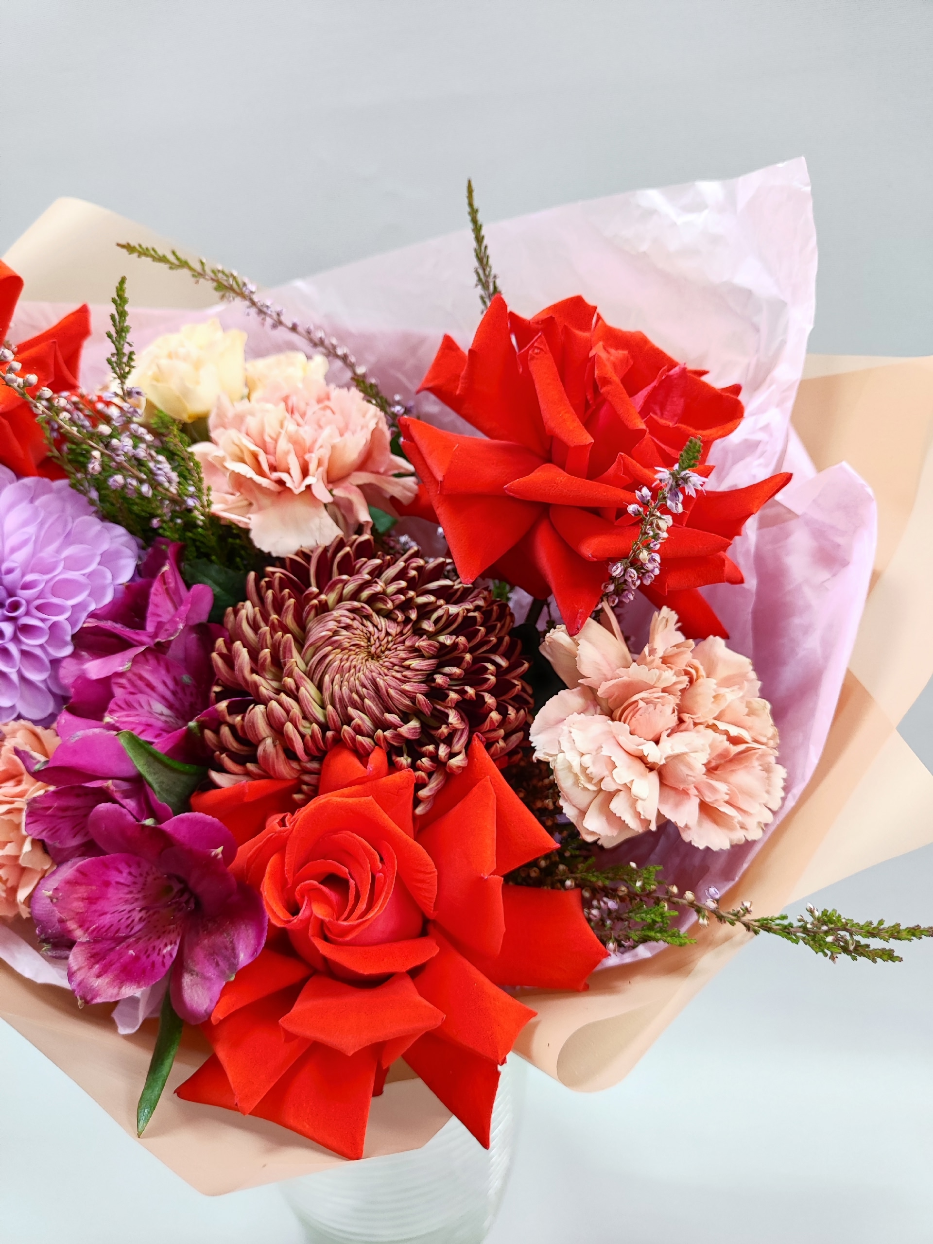 Букет с сортовой хризантемой Bigoudi, французскими розочками, далией, вереском, диантусом и альстромерией.