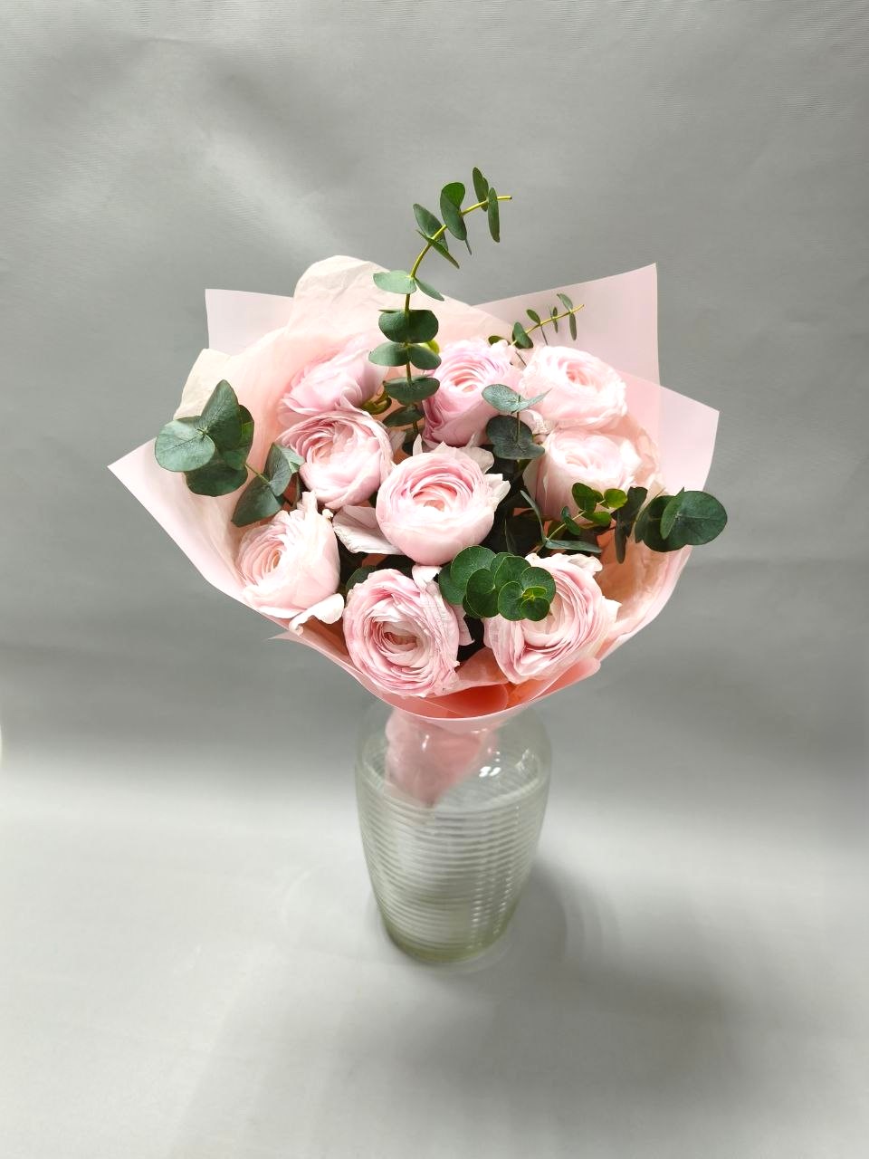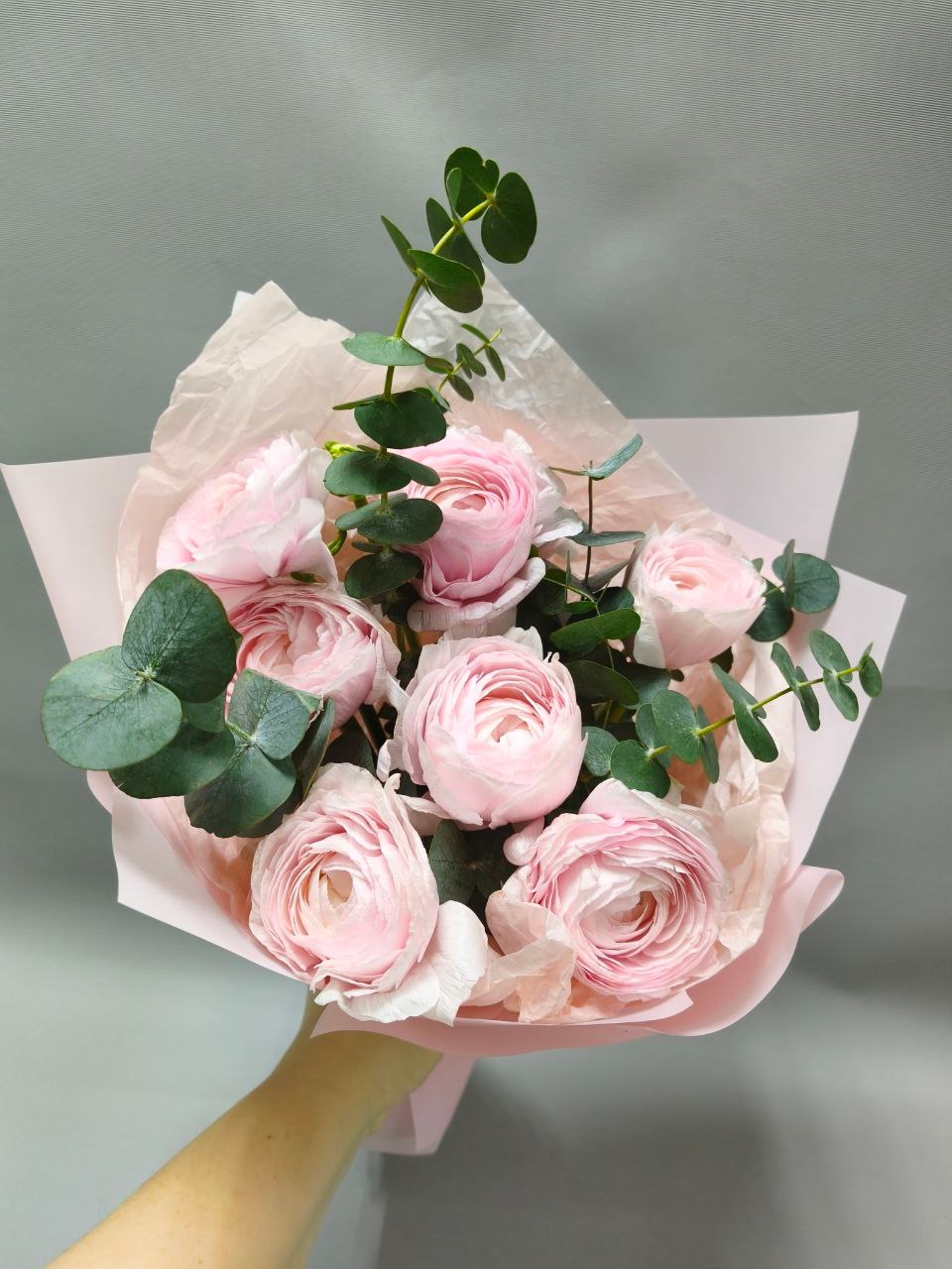Букет из 9 ранункулюсов с веточками эвкалипта.