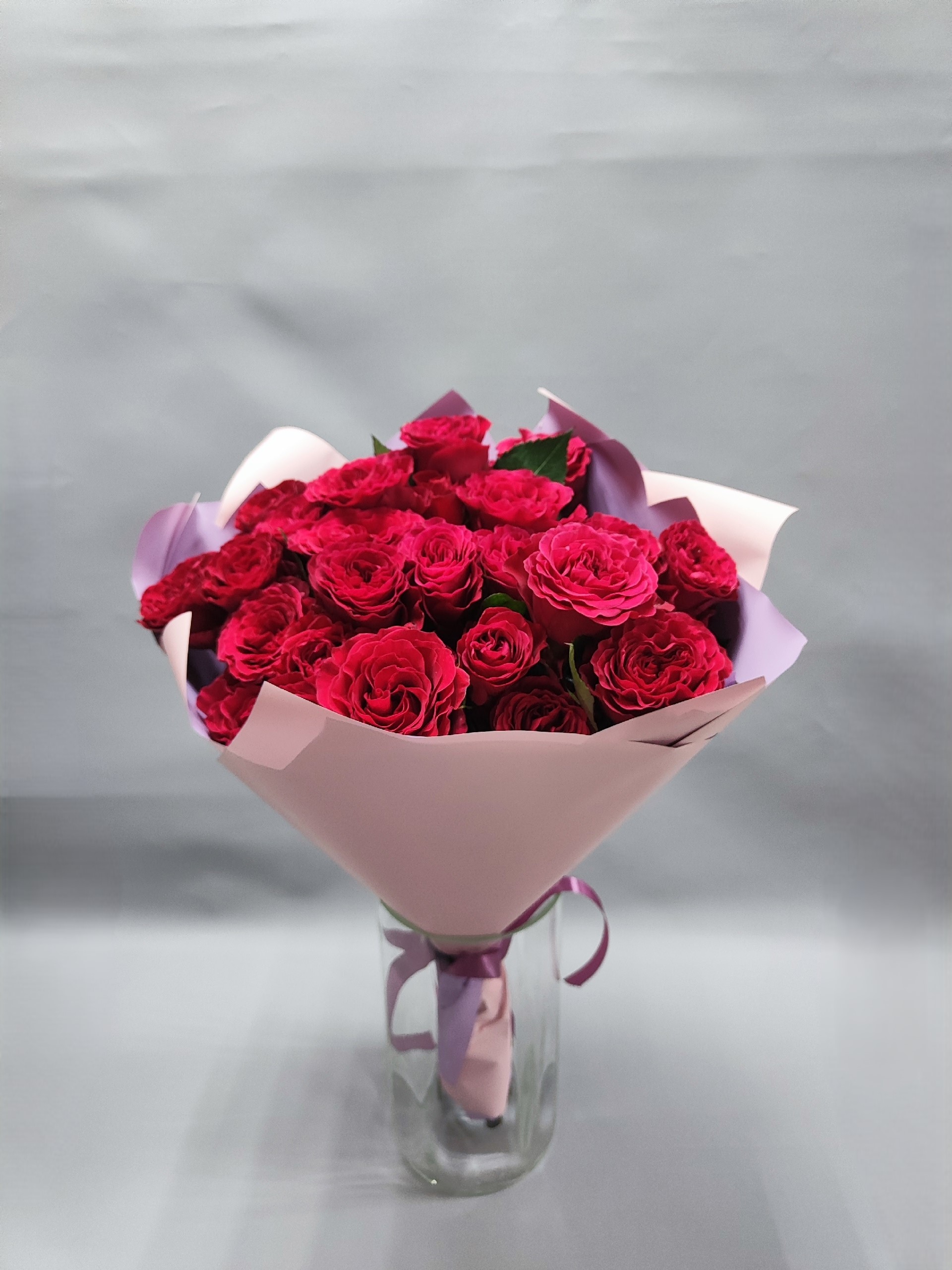 Букет из 7 высоких пионовидных кустовых розочек в упаковке.