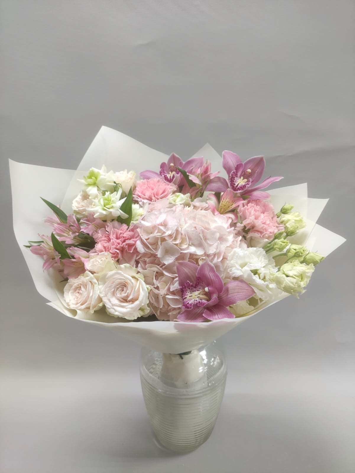 Букет в нежнейших оттенках с гортензией, кустовыми розочками, альстромерией, лизиантусом, орхидеями и диантусами.