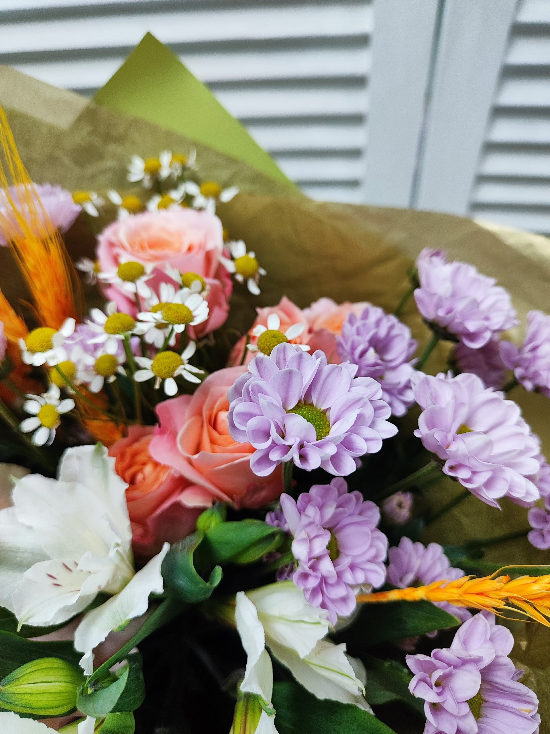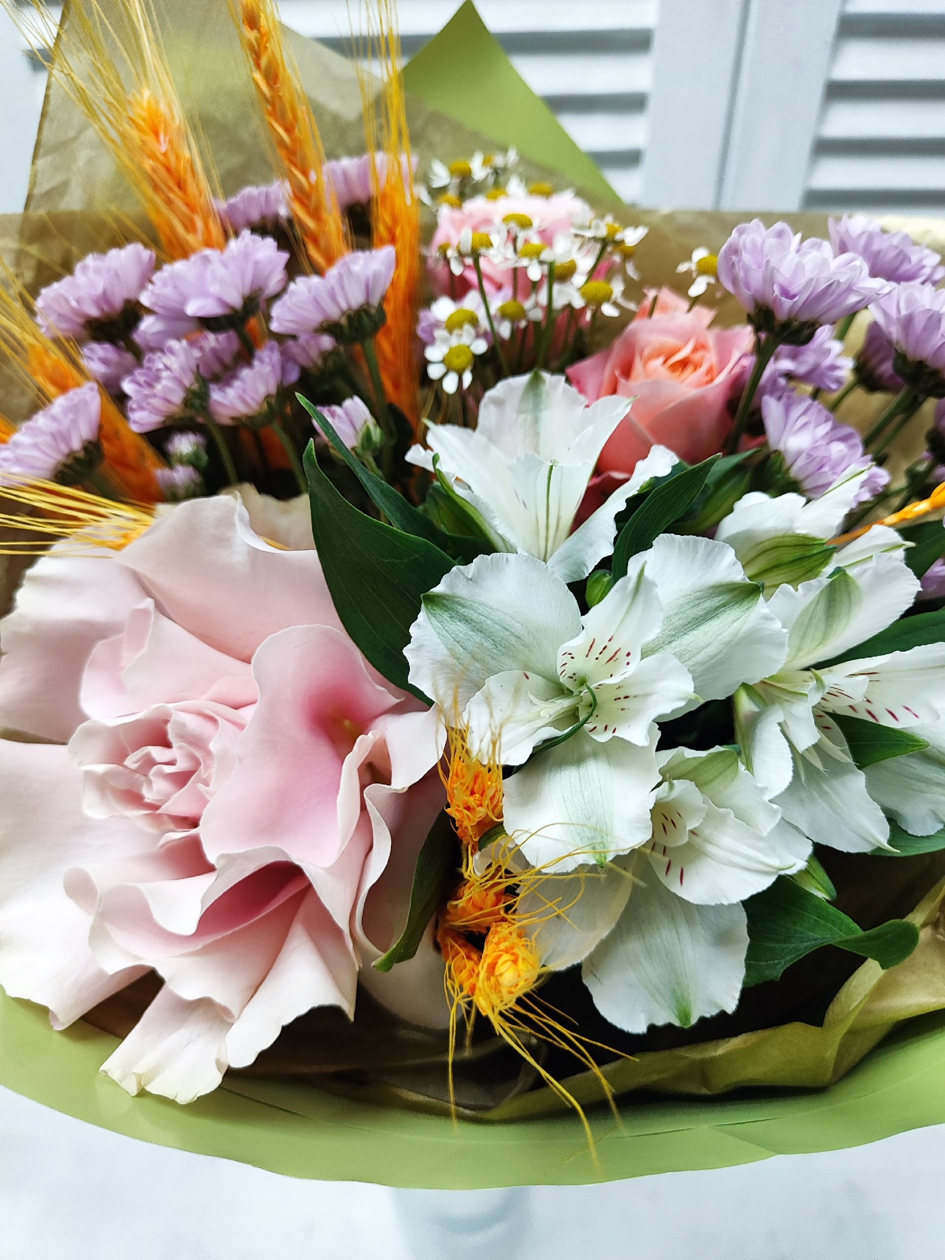 Букет с французской и кустовой розочками, альстромерией, мини хризантемой Сантини, танацетумом, колосками.