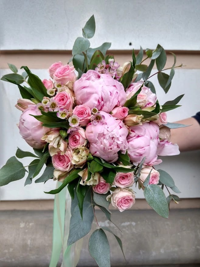 Букет невесты с пионами, кустовой розочкой и зеленью эвкалипта.