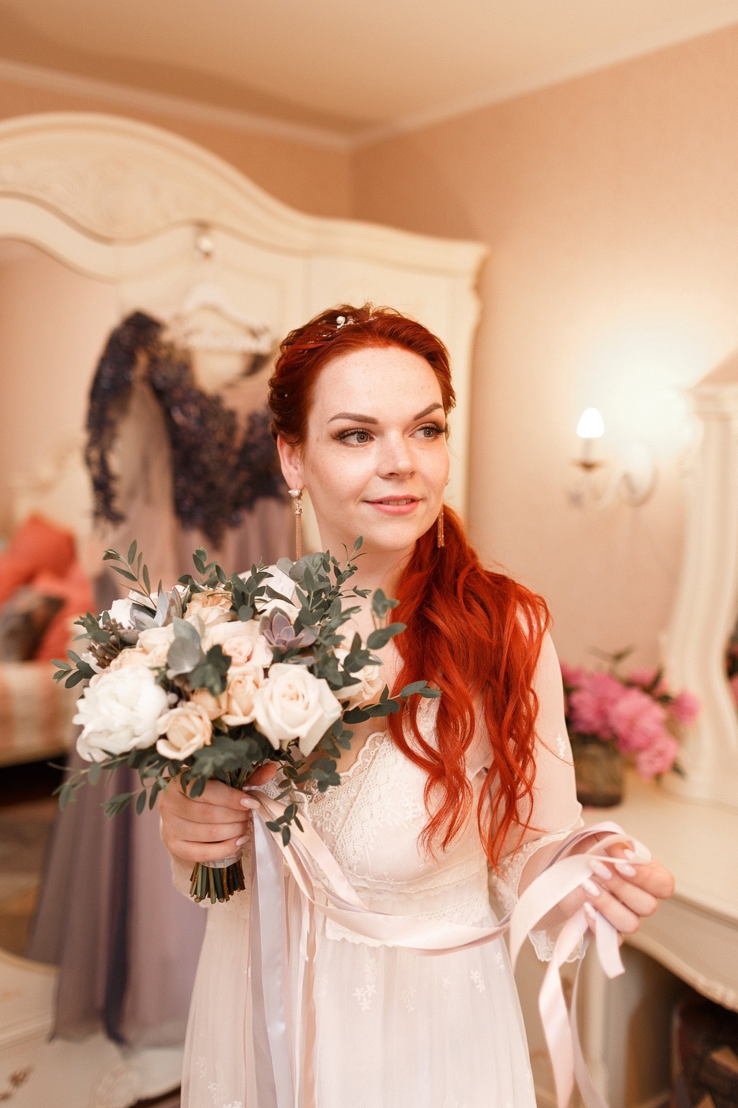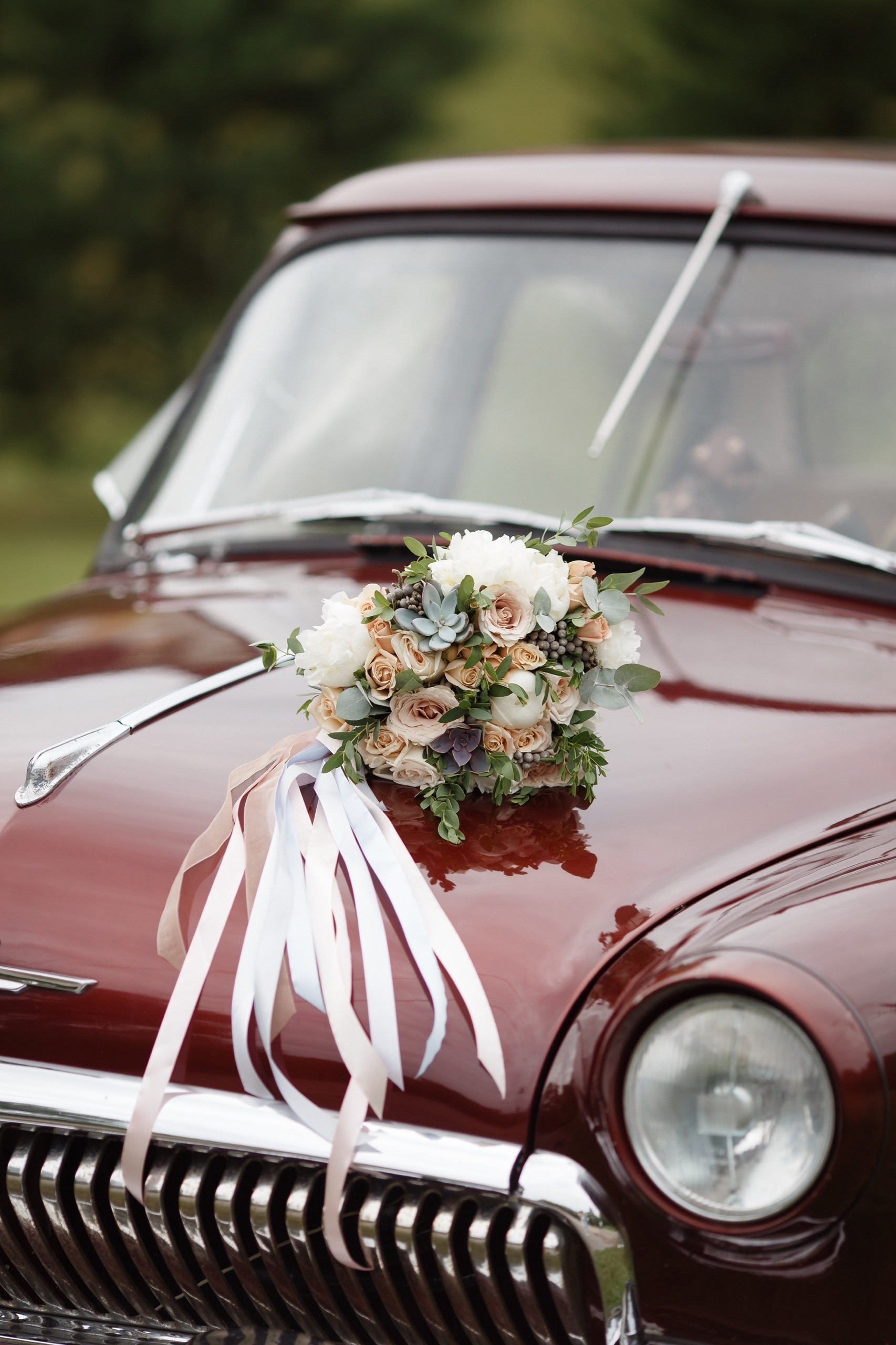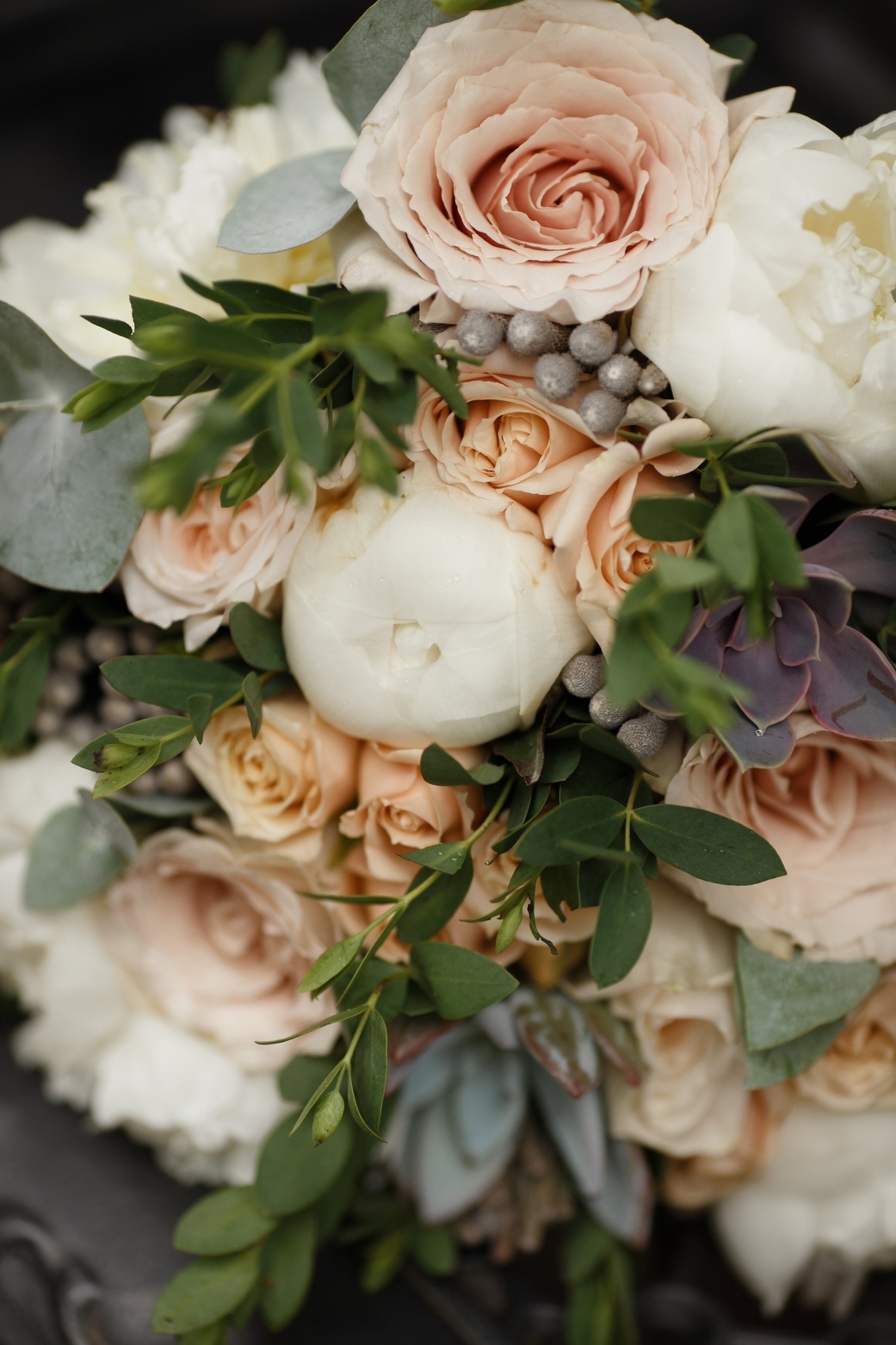 Букет невесты с пионами, кустовыми и одноголовыми розочками, суккулентами, брунией и зеленью эвкалипта.