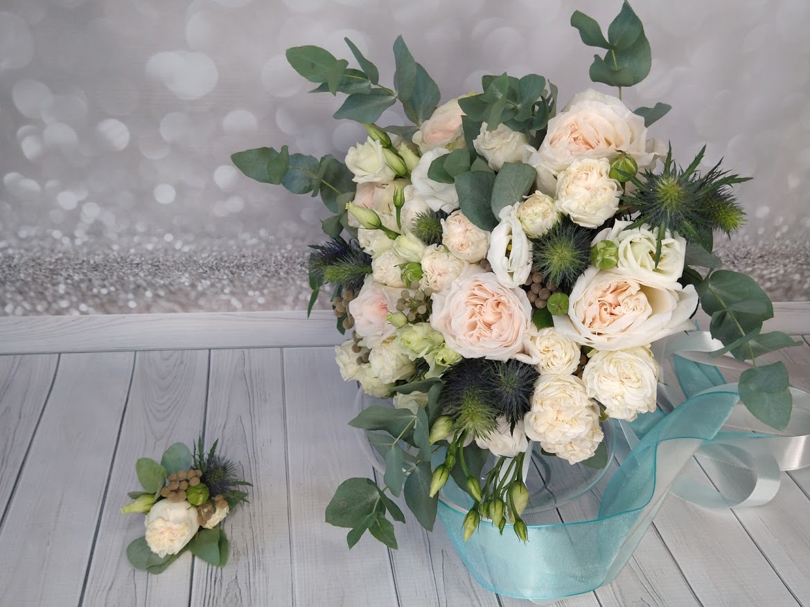 Букет невесты с пионовидными розами, эрингиумом, кустовыми розочками и зеленью эвкалипта.