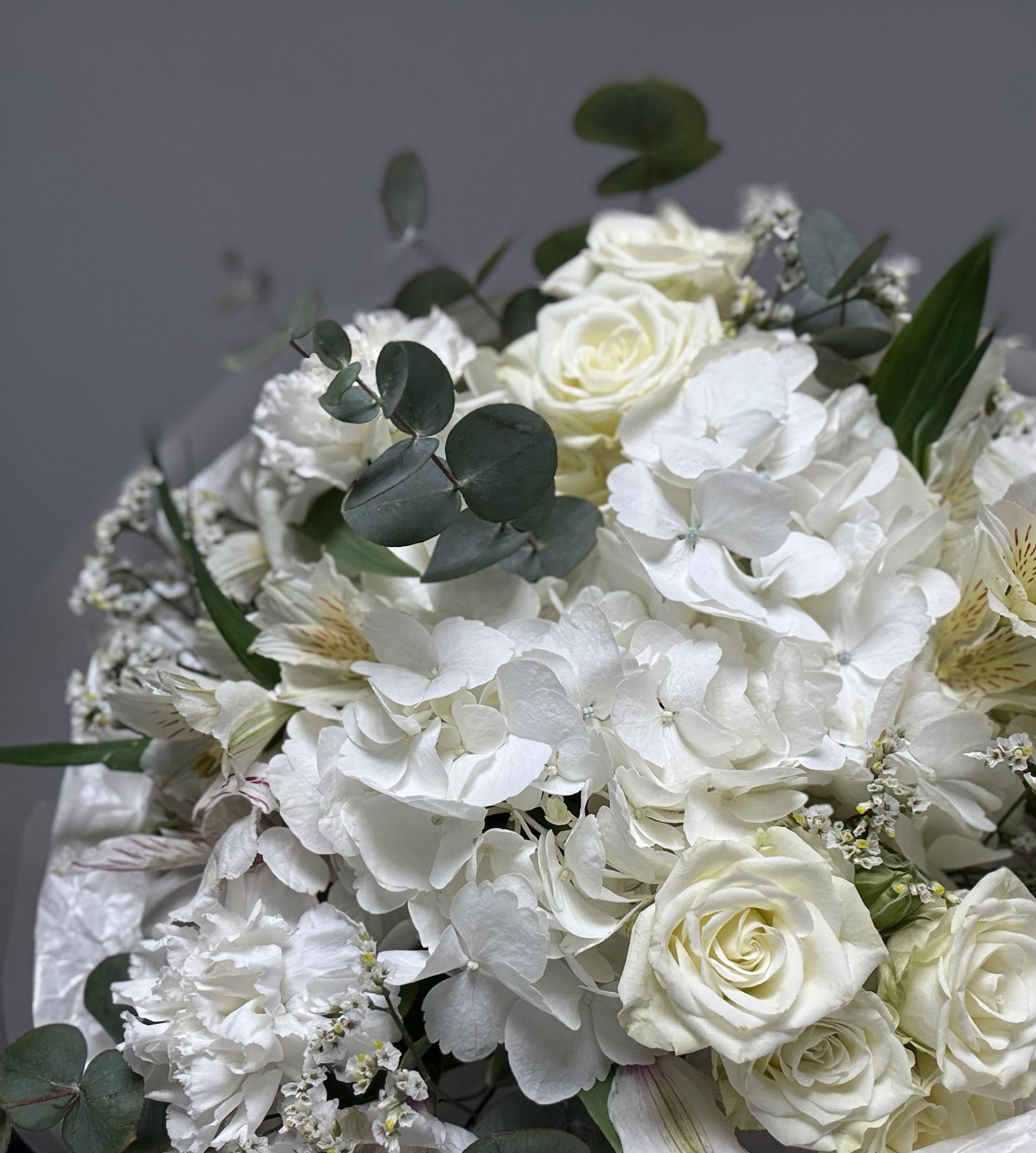 Прелестный букет в белых тонах с гортензией, кустовыми розочками, диантусами, лимониумом, альстромерией и веточками эвкалипта.