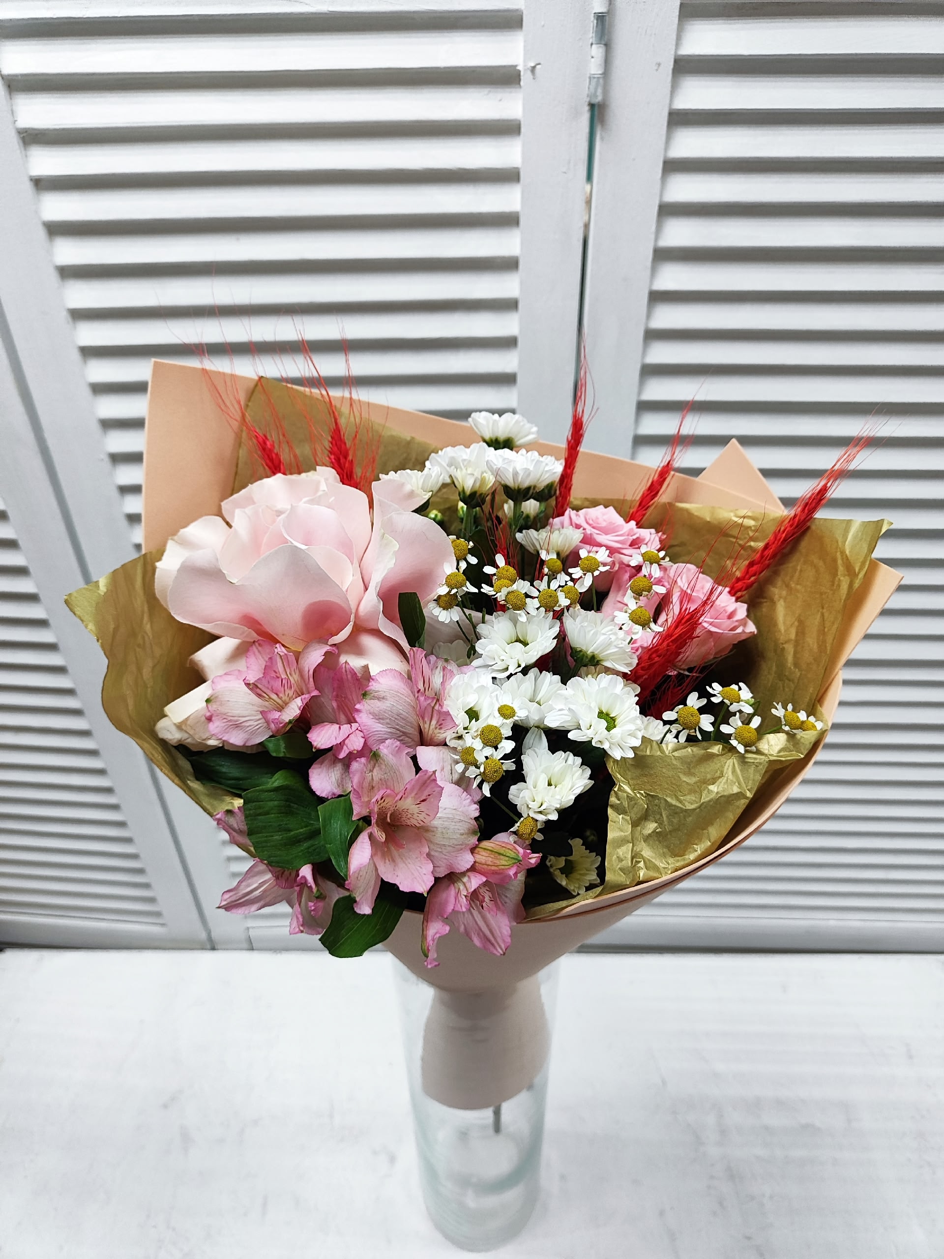 Букет с французской и кустовой розочками, альстромерией, мини хризантемой Сантини, танацетумом, колосками.