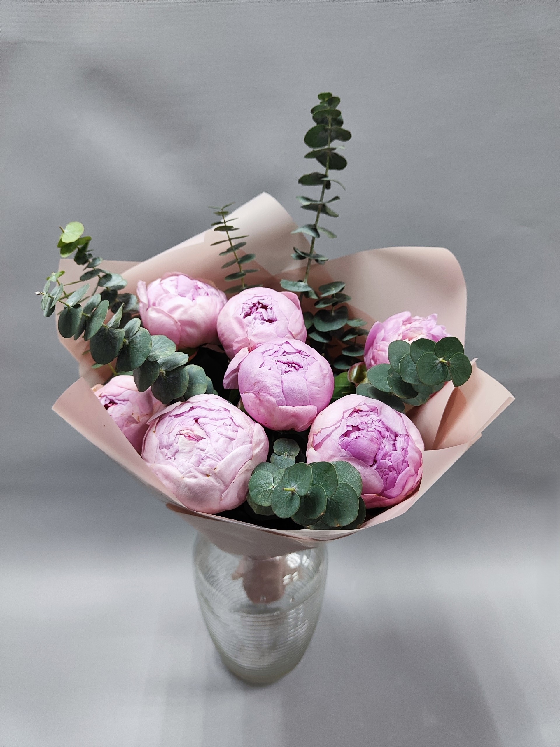 Букет из 7 пионов с веточками эвкалипта.