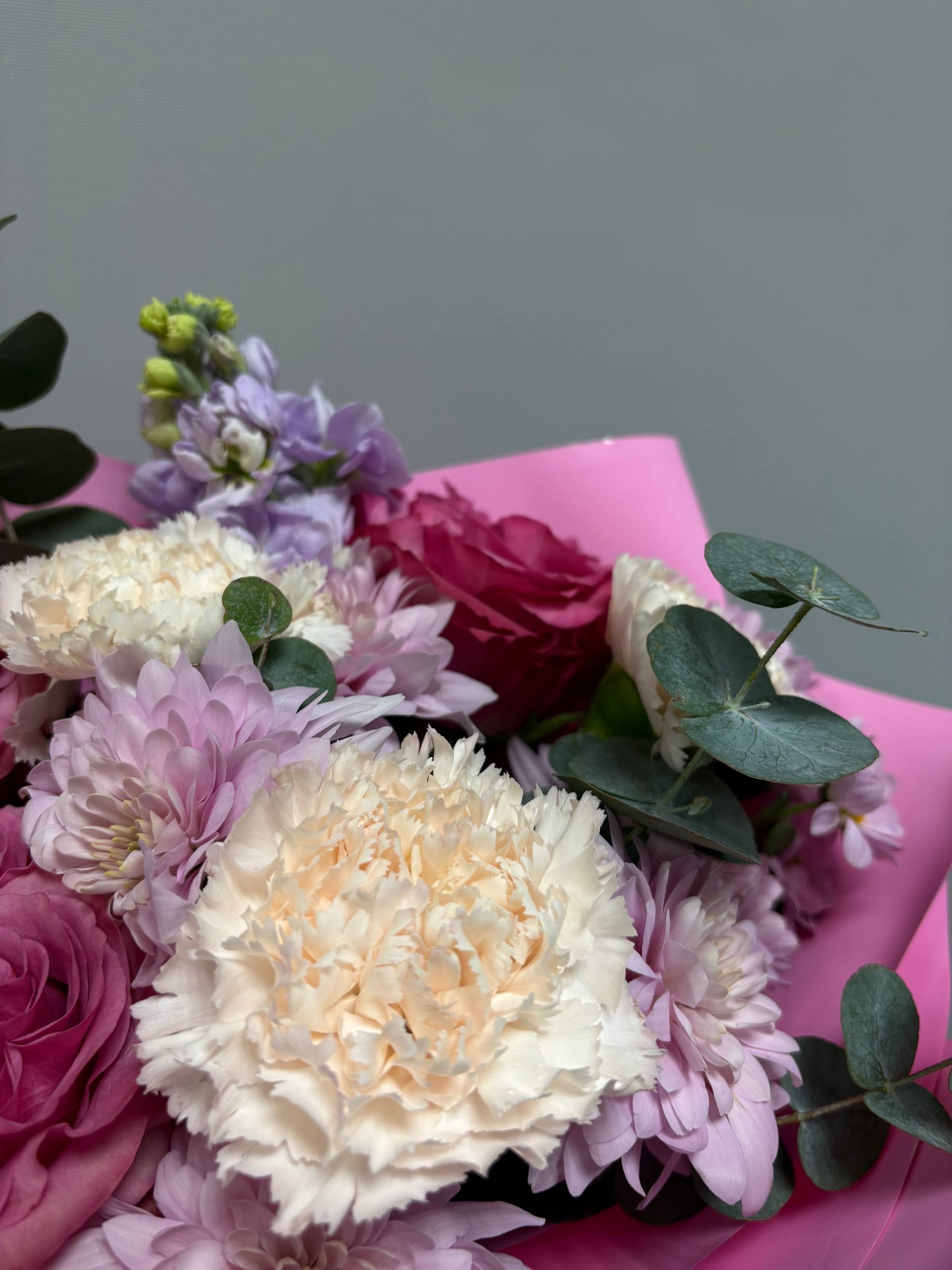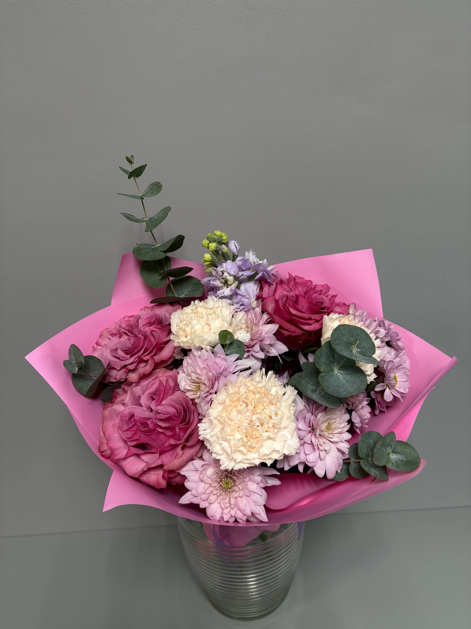 Прелестный букет в ягодных оттенках с пионовидными розами, кустовой хризантемой, маттиолой, диантусами и веточками эвкалипта.