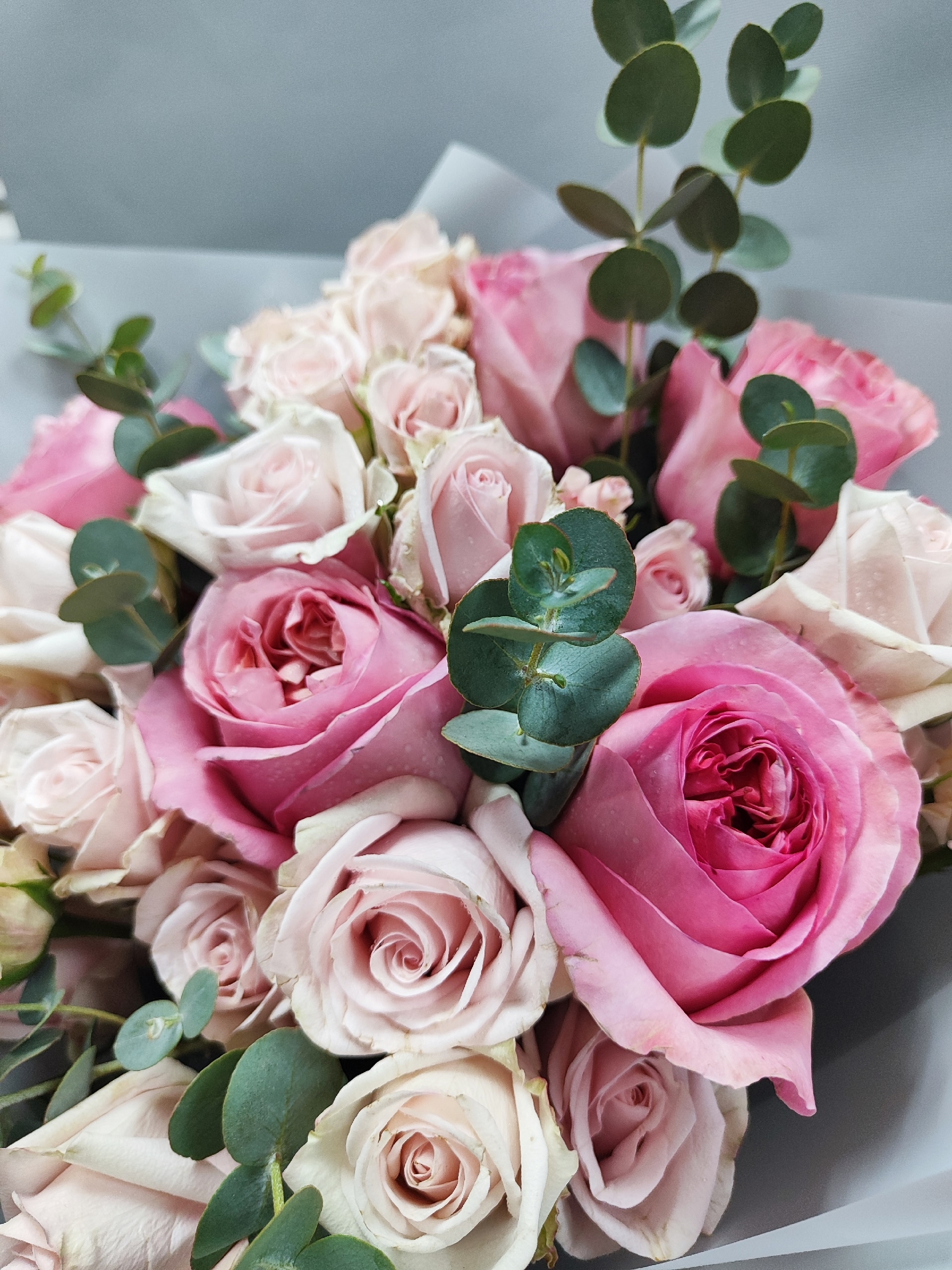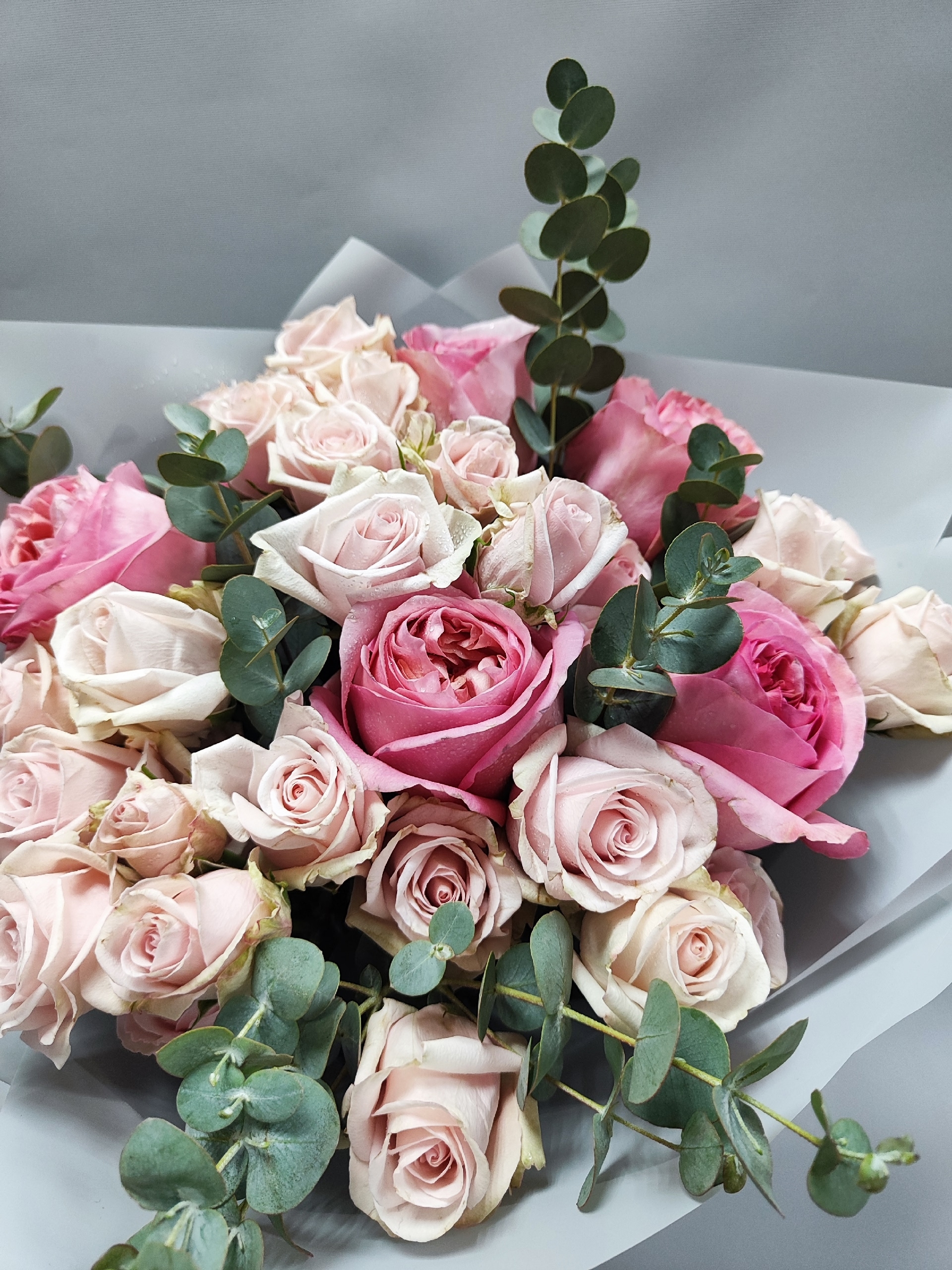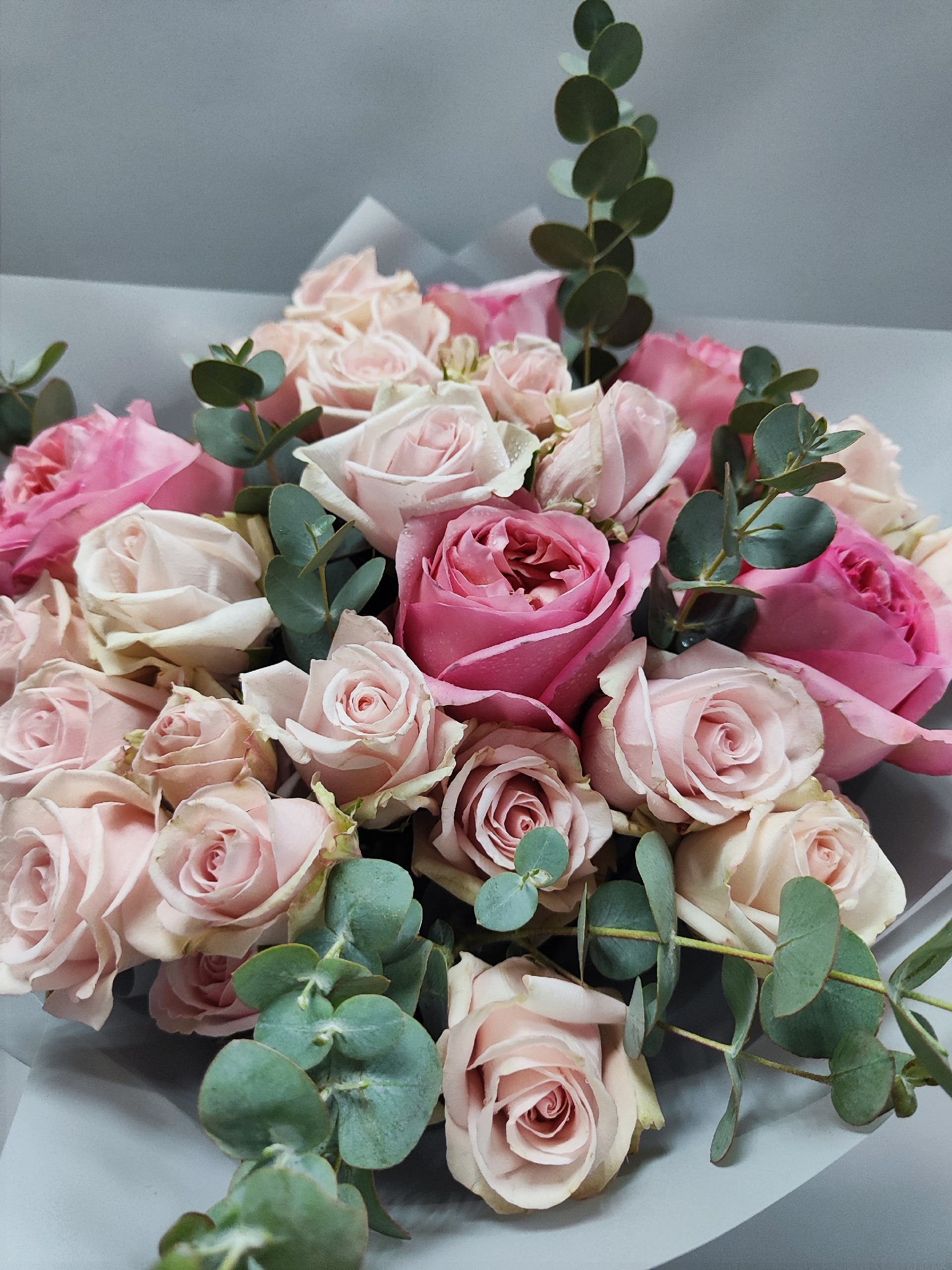 Букет с пионовидными розами, веточками эвкалипта и кустовыми розочками.