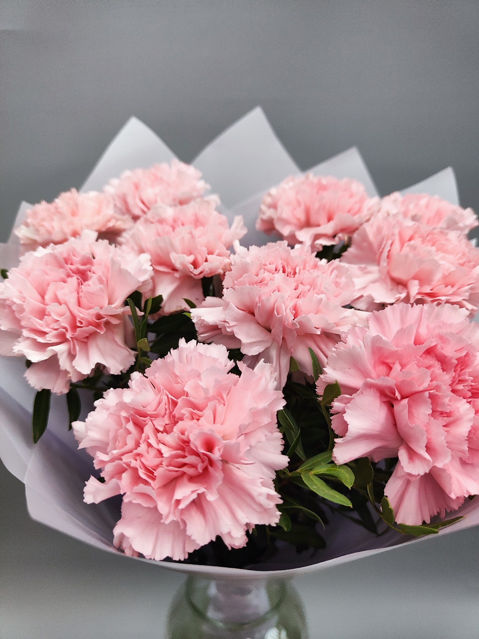 Букет из розовых диантусов с зеленью фисташки.