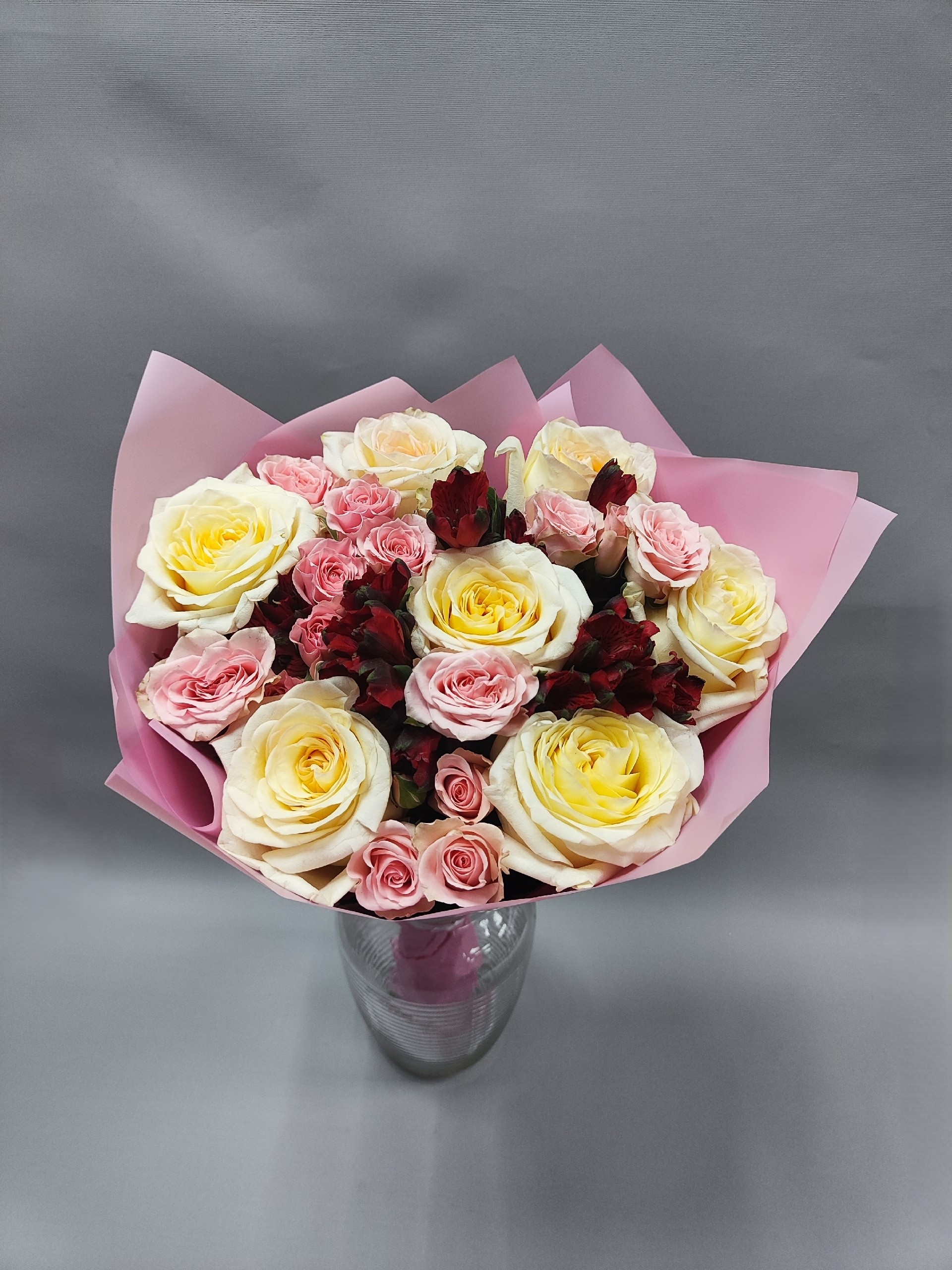 Букет с пионовидными розами, альстромериями и кустовыми розочками.
