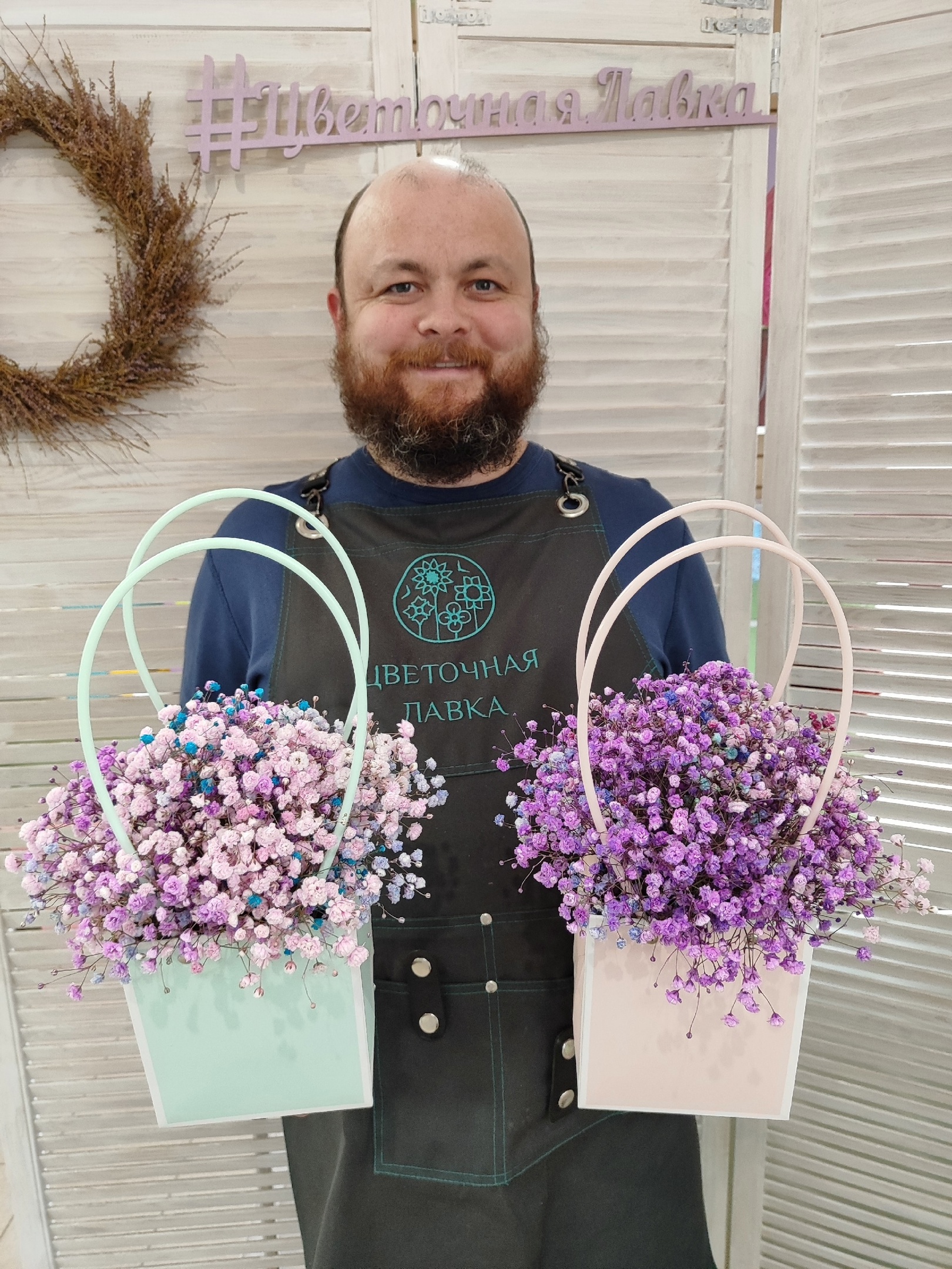 Композиция из разноцветной гипсофилы в сумочке