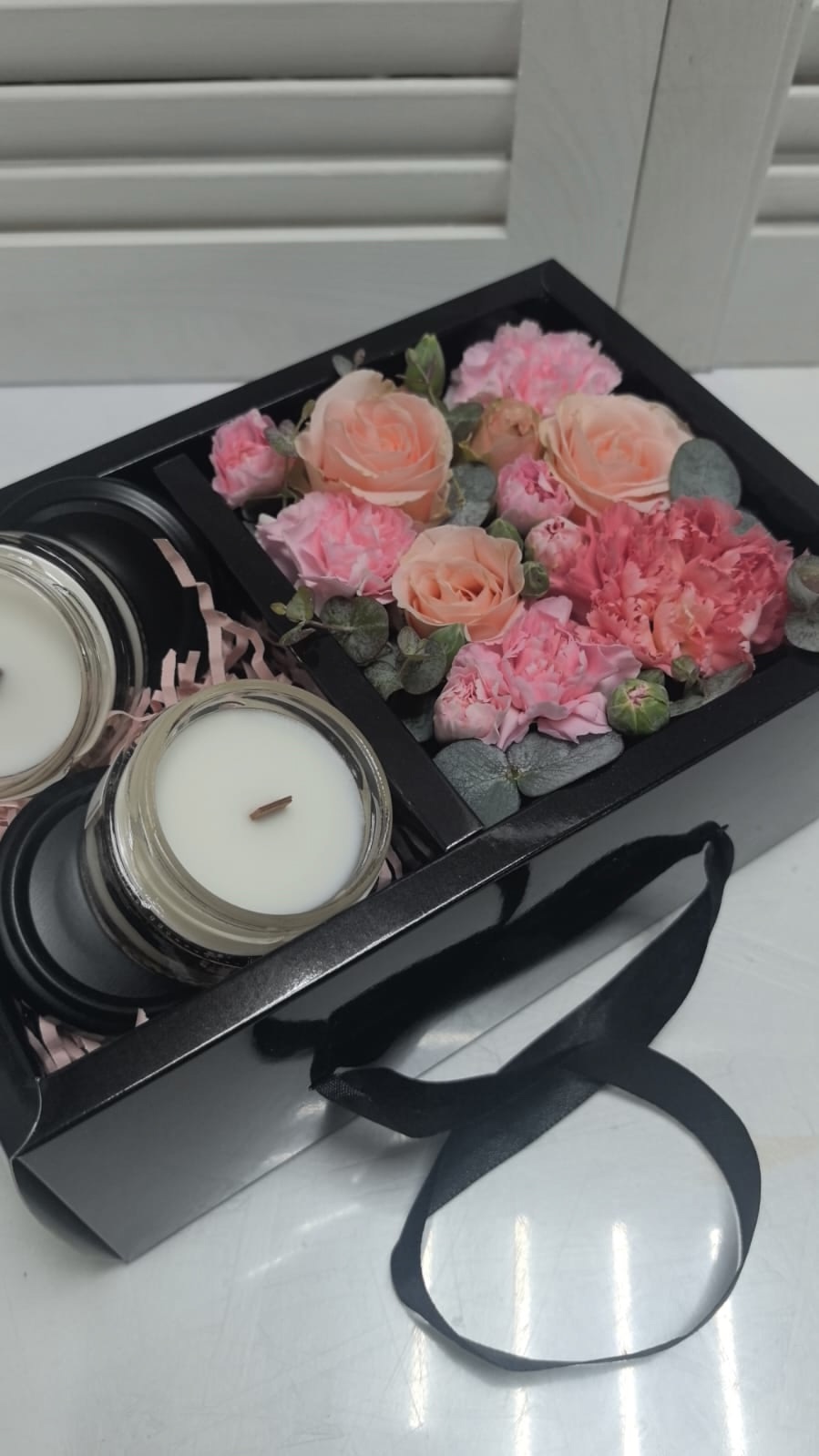 Цветочная композиция с ароматическими свечами в стильной коробочке.
