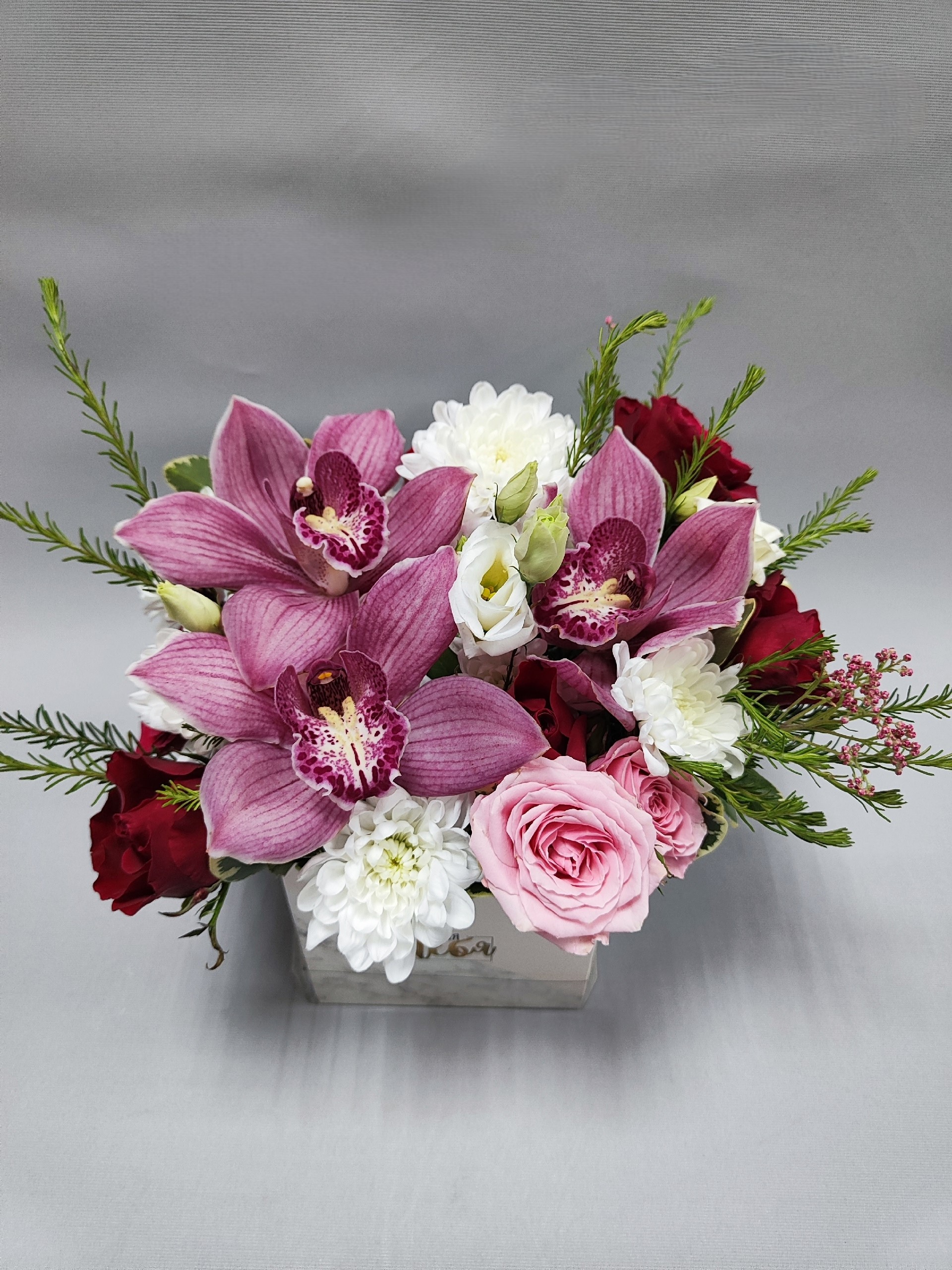 Композиция в прелестной коробочке с кустовыми розами и хризантемами, орхидеями, лизиантусом и веточками зелени.