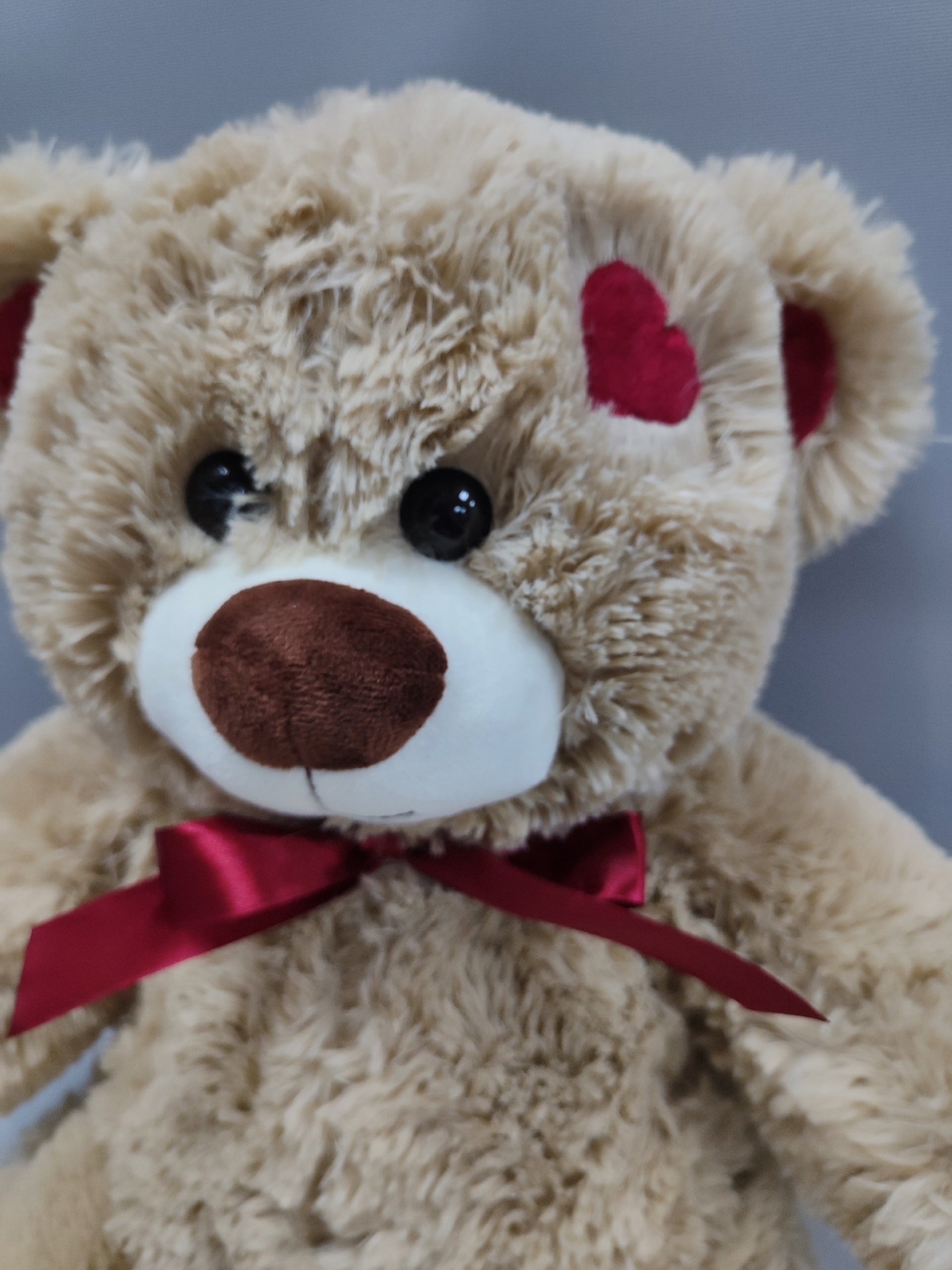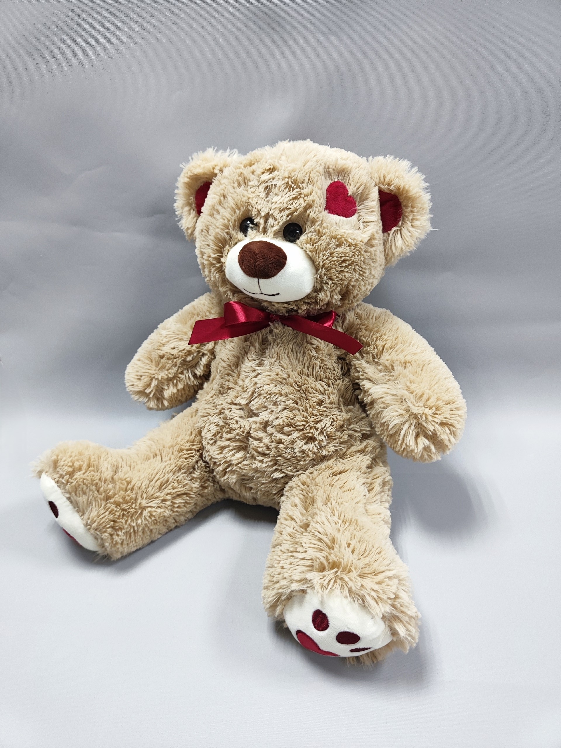Особенность этого медвежонка - очаровательное сердечко, которое красуется у него на голове. Маленькие сердечки также украшают его лапки, добавляя ему еще больше милоты.