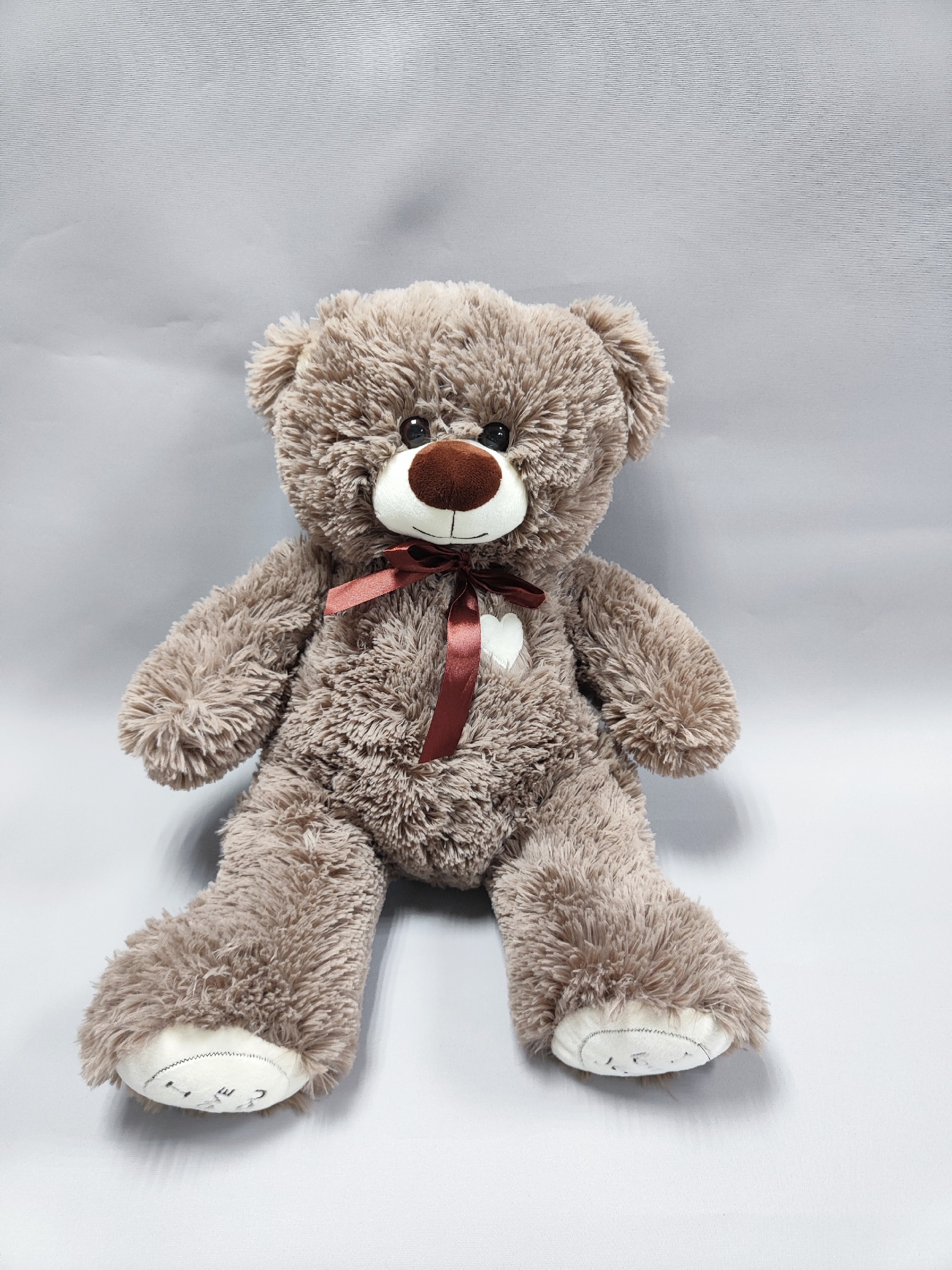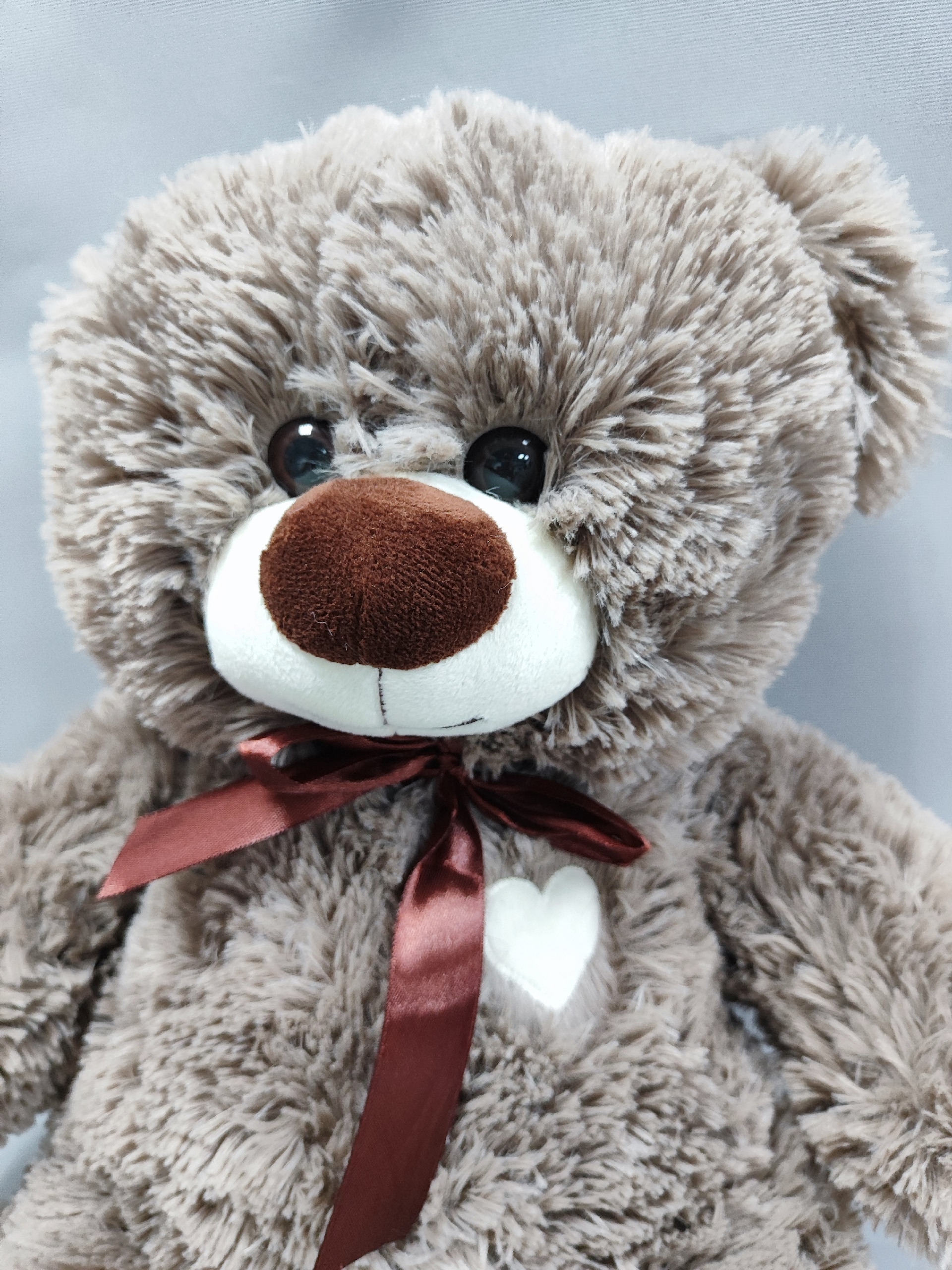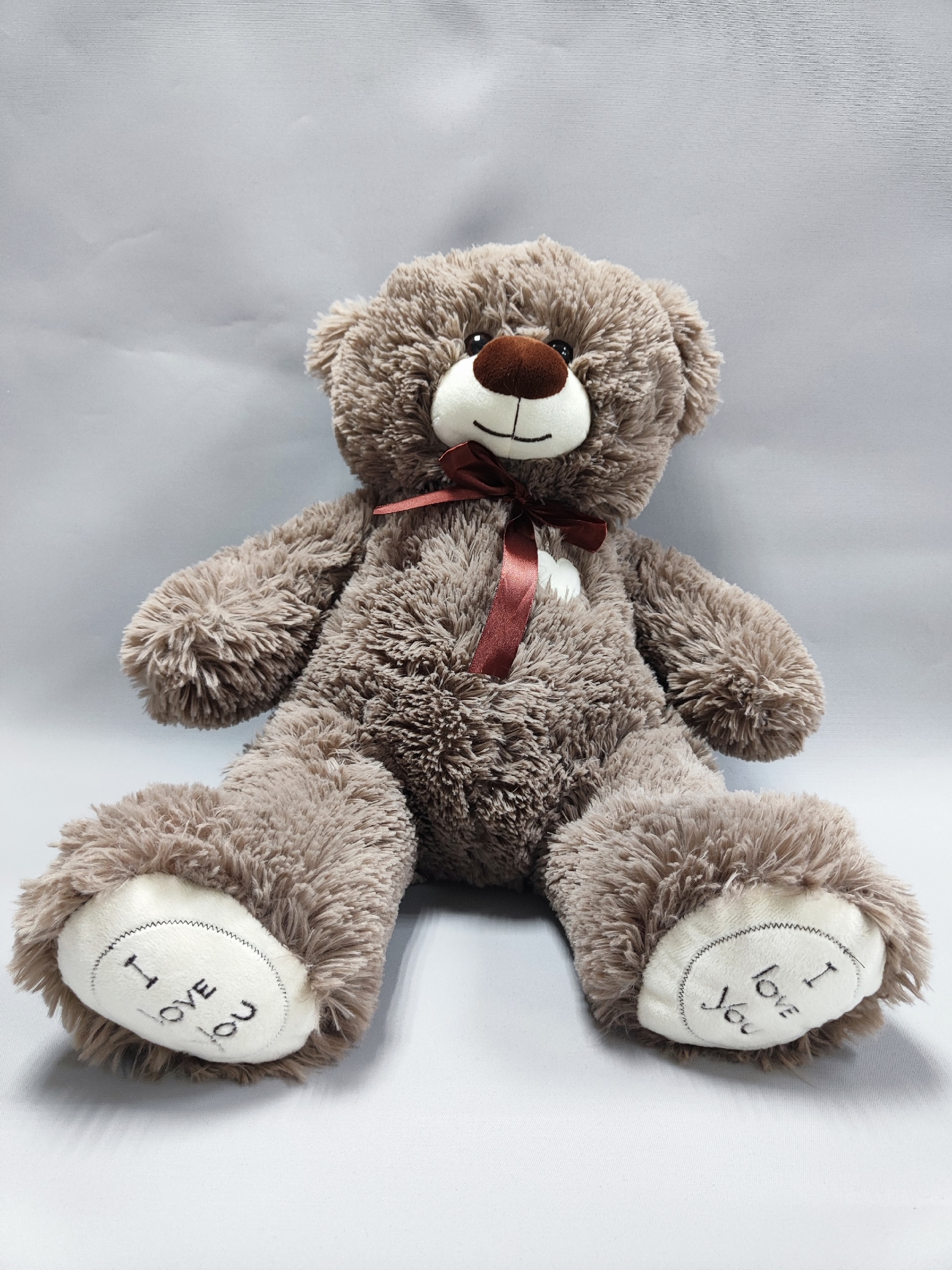 Просто чудесный и мягкий медвежонок. Его шерстка приятного светло-коричневого оттенка, а на шее красуется аккуратный бантик. На каждой лапке вы найдете трогательную вышивку: "Я тебя люблю", а на груди у медвежонка нежное сердечко.
